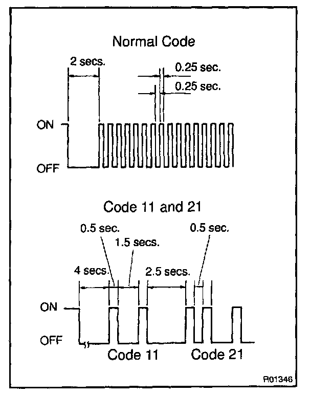 - As an example, the blinking patterns for normal code and codes 11 and 21 are shown on the left.