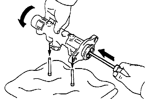 a. Push in the piston with a screwdriver, and remove the 2 straight pins by turning over the cylinder body.