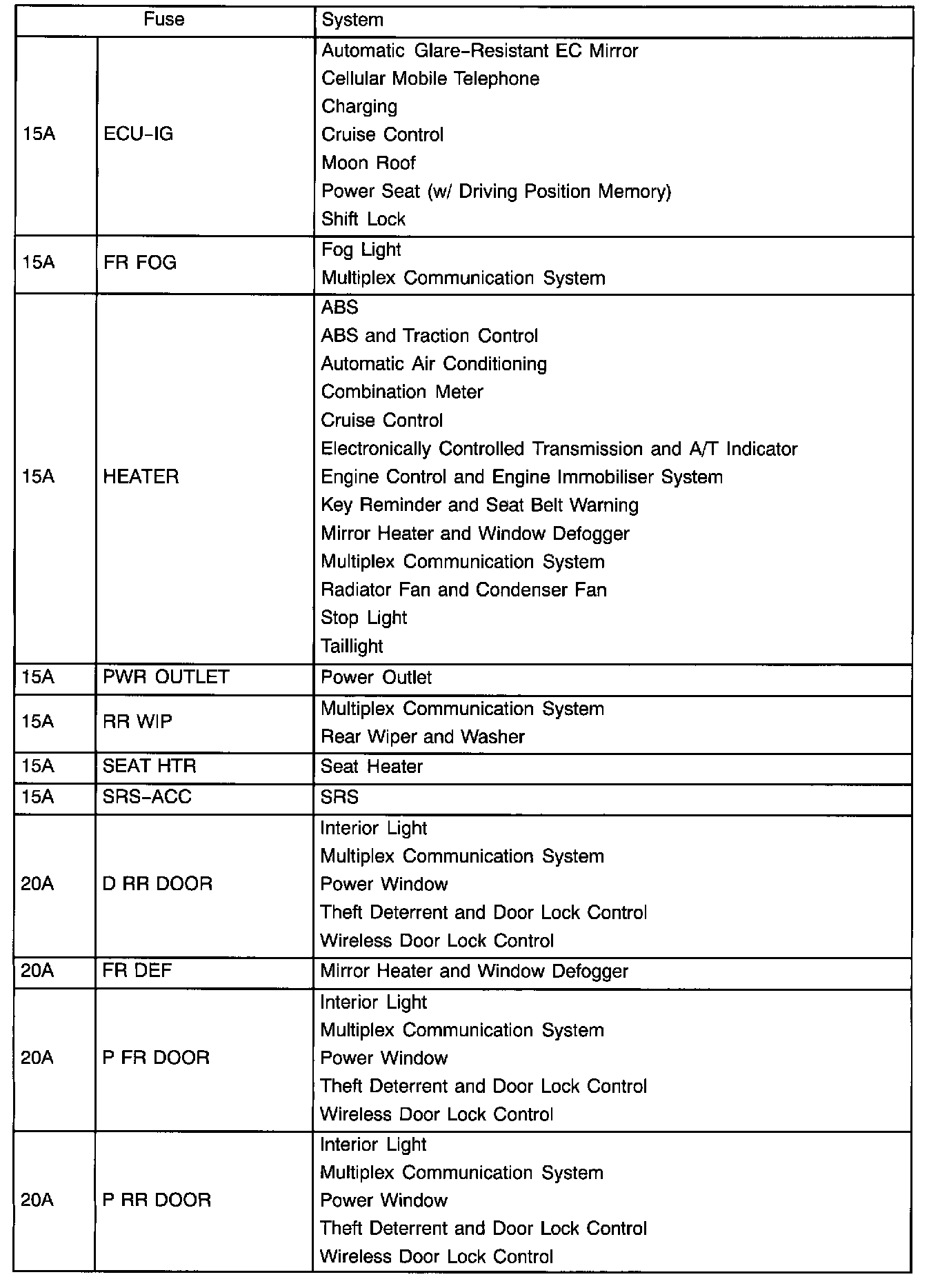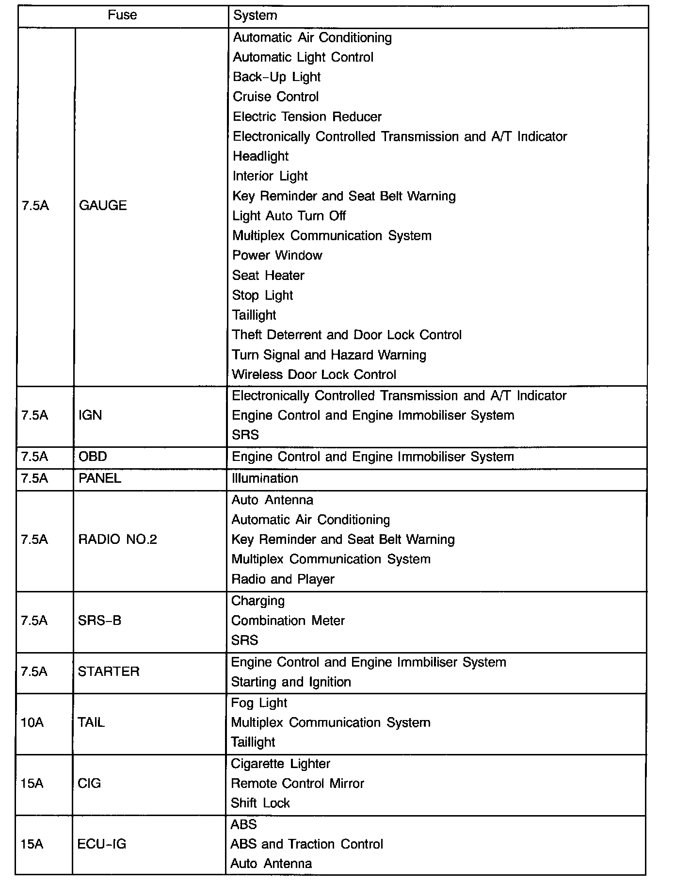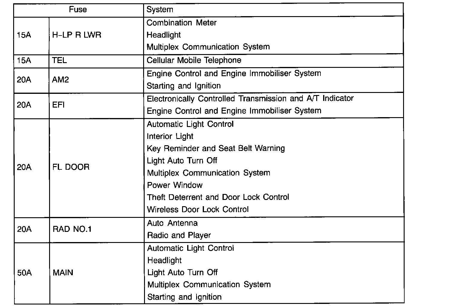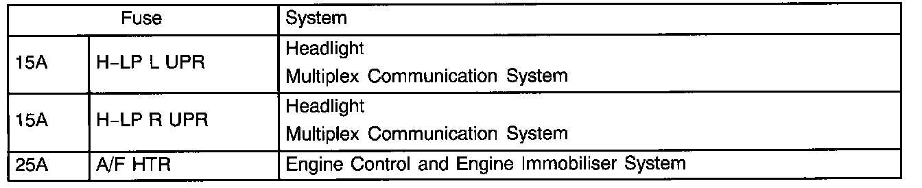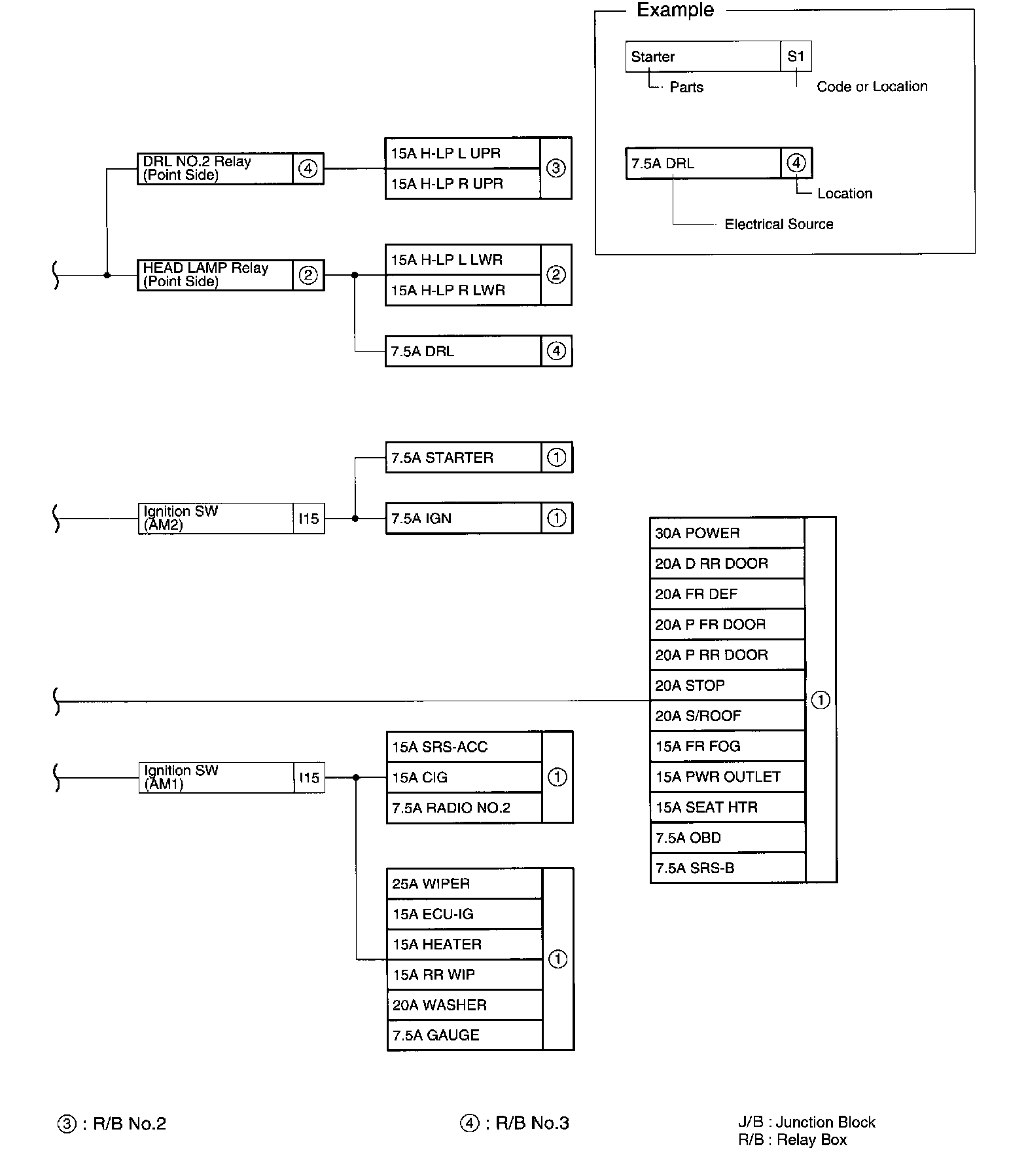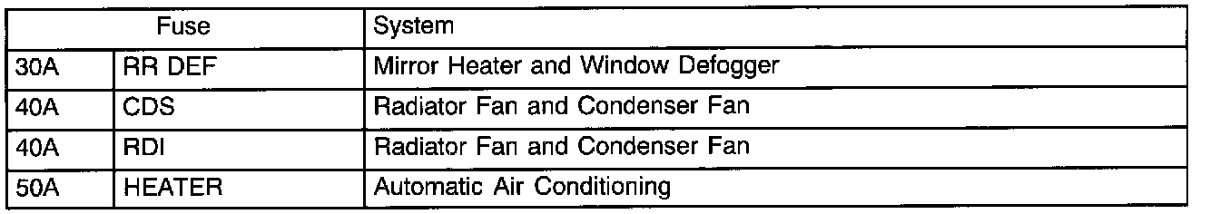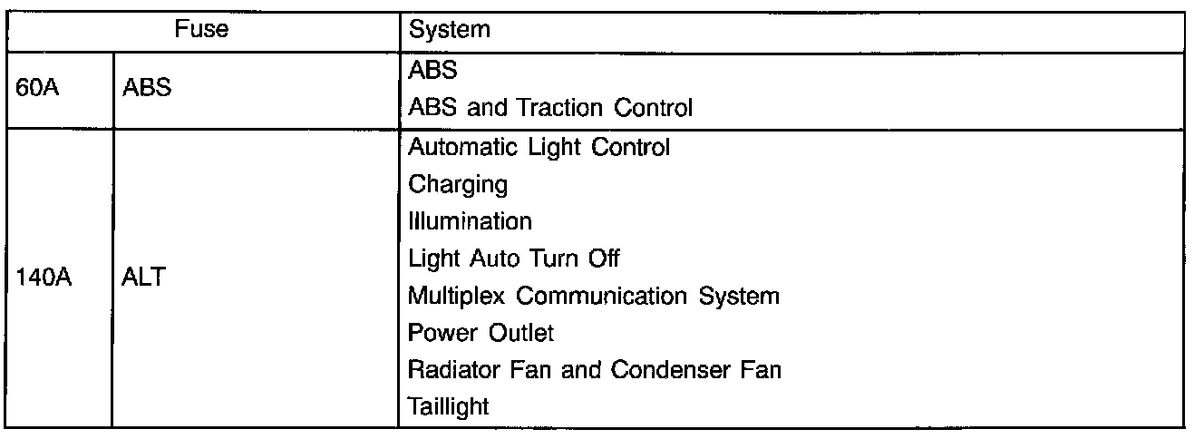 The chart below shows the route by which current flows from the battery to each electrical source (Fusible Link, Circuit Breaker, Fuse, etc.) and other Parts.