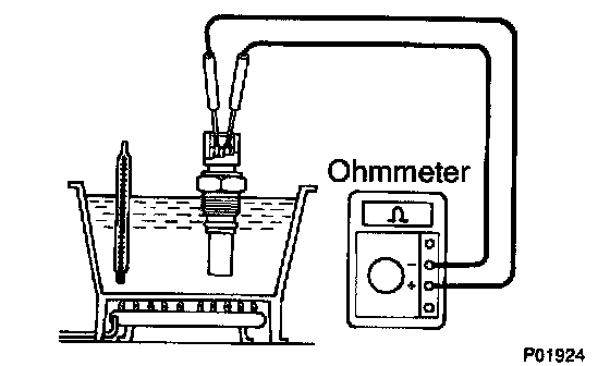 1. Using an ohmmeter, check that there is no continuity between the terminals when the coolant temperature is above 98°C (208°F).