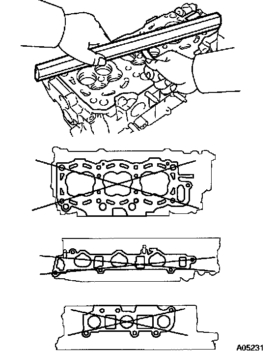 Using a precision straight edge and feeler gauge, measure the surfaces contacting the cylinder block and the manifolds for warpage.