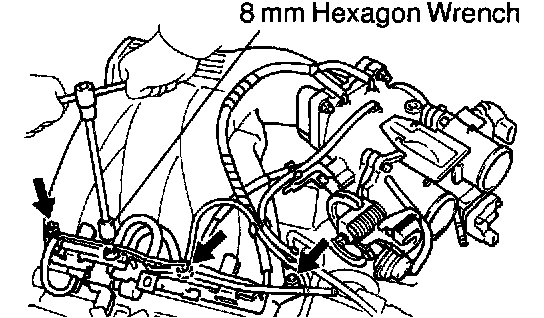 a. Using an 8 mm hexagon wrench, remove the cylinder head (recessed head) bolt on each cylinder head, then repeat for the other side, as shown.