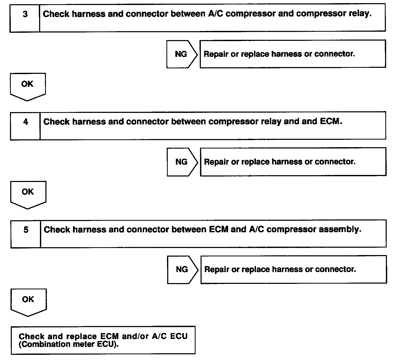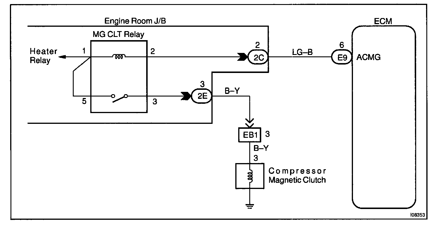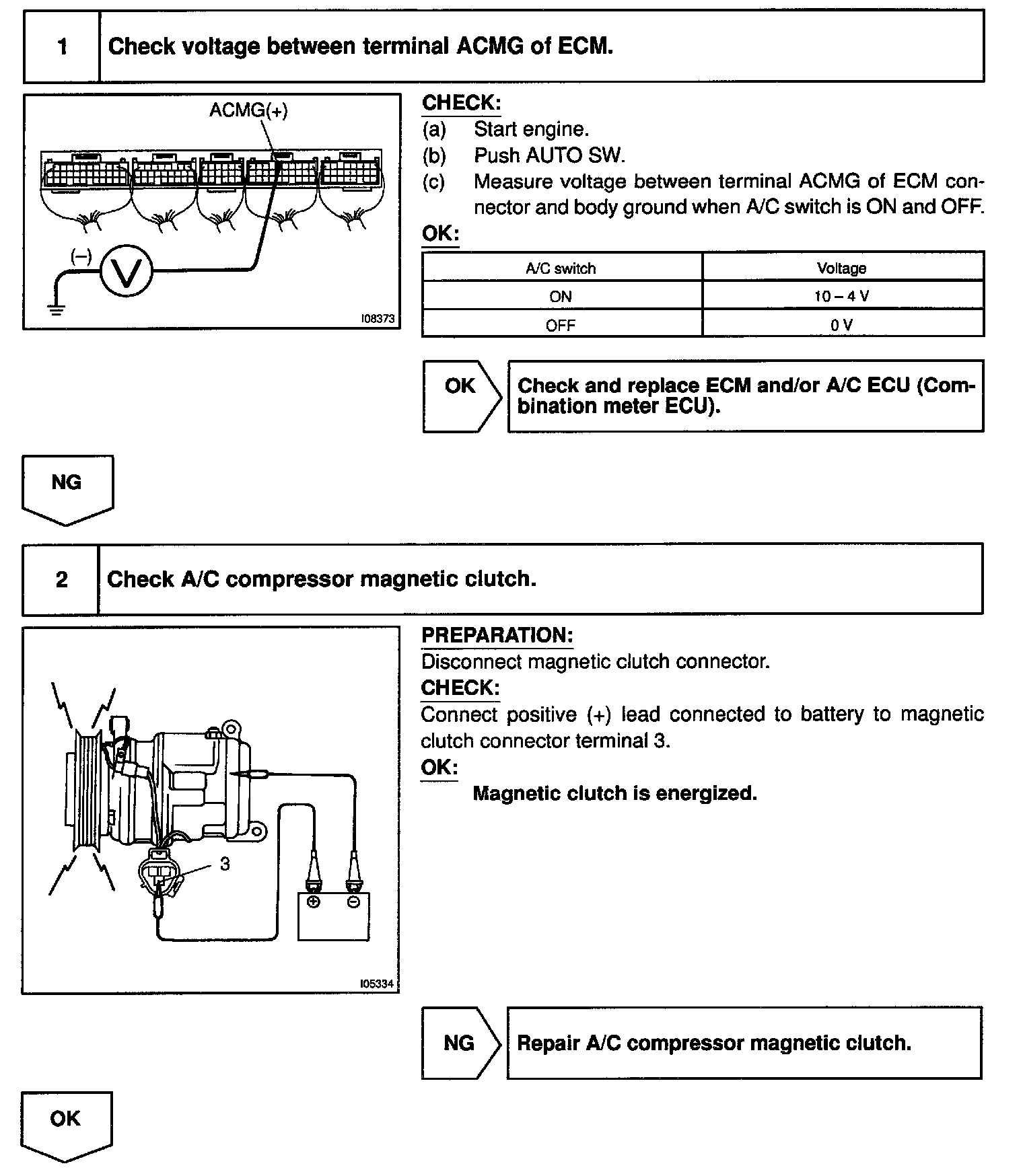 CIRCUIT DESCRIPTIONThe A/C ECU (Combination meter ECU) outputs the magnetic clutch ON signal from terminal MGC to the ECM. When the ECM receives this signal, it sends a signal from terminal ACMG and switches the A/C magnetic clutch relay ON, thus turning the A/C compressor magnetic clutch ON.