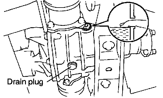Remove the filler plug and feel inside the hole with your finger. Check that the oil comes to within 5 mm (0.20 in.) of the bottom edge of the hole. If the level is low, add oil until it begins to run out of the filler hole.