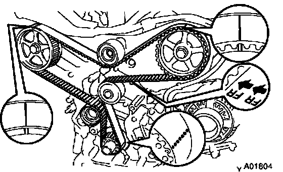 If the installation and front marks have disappeared, before removing the timing belt, place 3 new installation marks on the timing belt to match the timing marks of the timing pulleys, and place a new front mark on the timing belt.