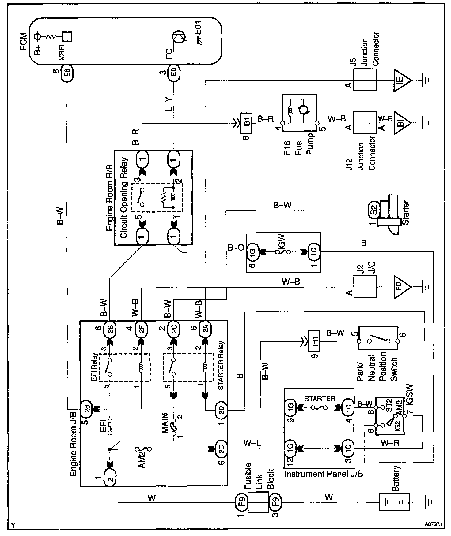 In the diagram, when the engine is cranked, current flows from terminal ST of the ignition switch to the starter relay coil and also current flows to terminal STA of ECM (STA signal).
