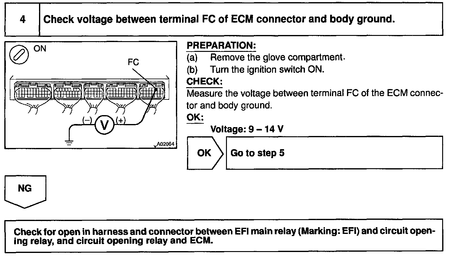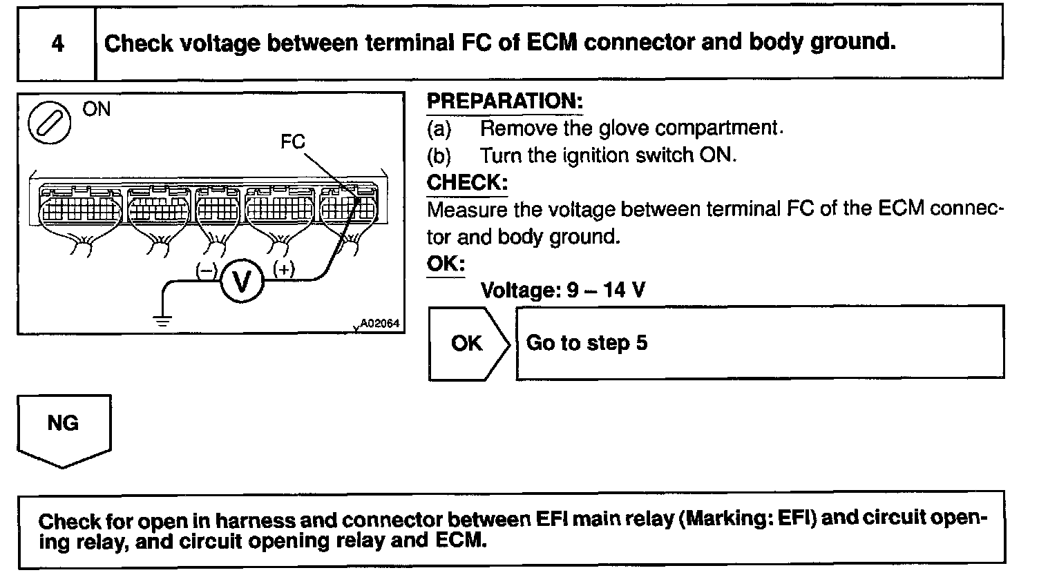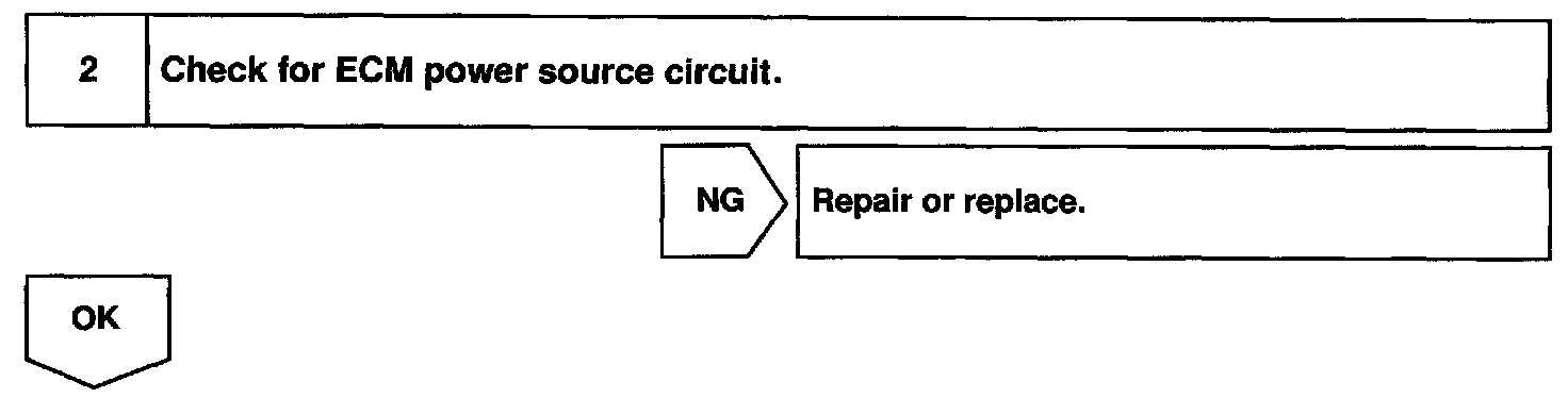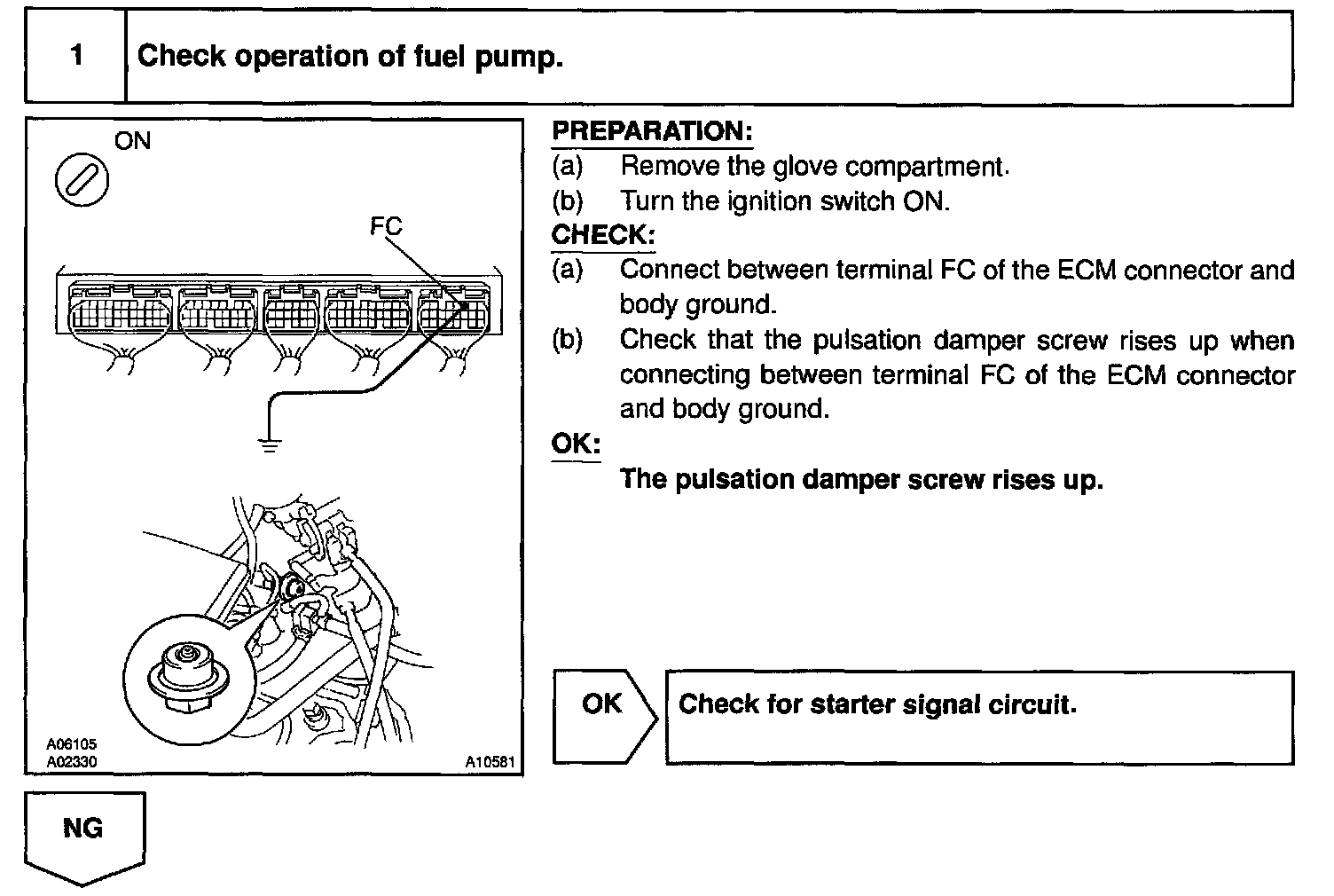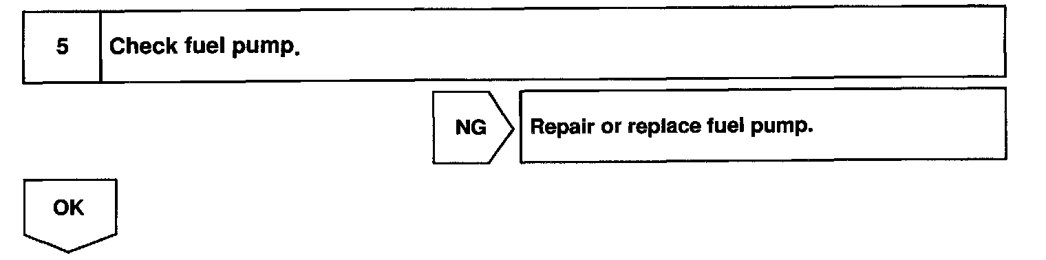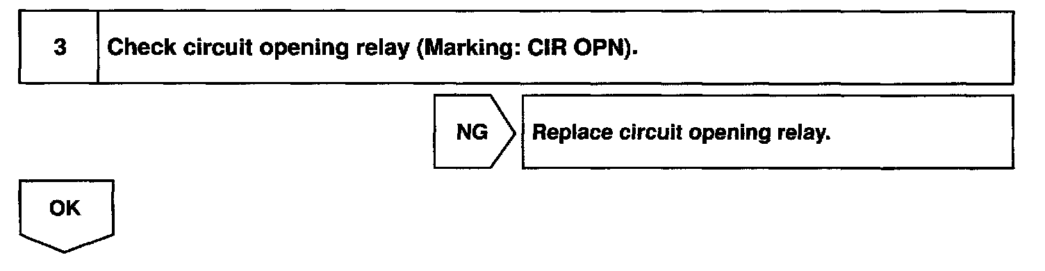 When the STA signal and NE signal are input to the ECM, Tr is turned ON, current flows to coil of the circuit opening relay, the relay switches on, power is supplied to the fuel pump and the fuel pump operates. While the NE signal is generated (engine running), the ECM keeps Tr ON (circuit opening relay ON) and the fuel pump also keeps operating.