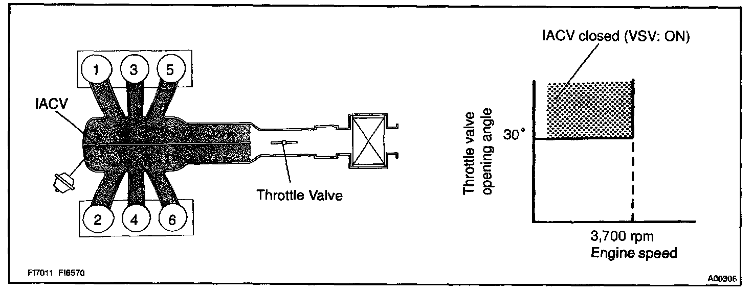 When the engine speed is 3,700 rpm or less and the throttle valve opening angle is 30 ° or more, the ECM turns the VSV ON and closes the IACV. At all other times, the VSV is OFF, so the IACV is open.