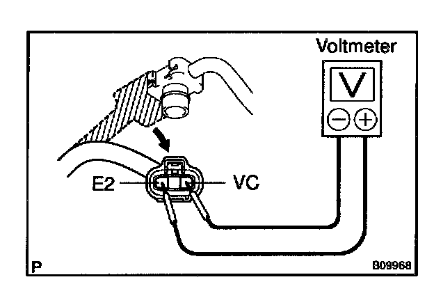 b. Using a voltmeter, measure the voltage between connector terminals VC and E2 of the wiring harness side.