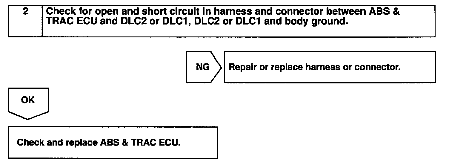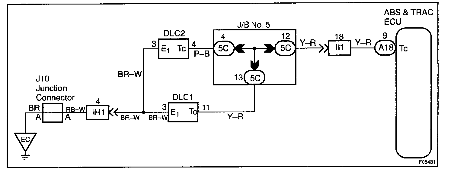 CIRCUIT DESCRIPTIONConnecting between terminals Tc and E1 of the DLC1 or the DLC2 causes the ECU to display the DTC by blinking the ABS warning light and TRAC OFF indicator light.