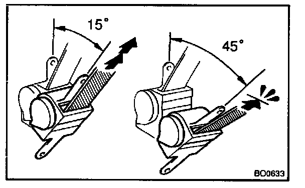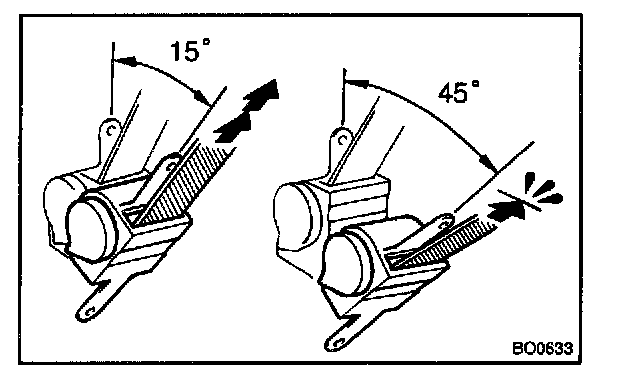 d. Make sure that the belt can be pulled out at a tilt of 15 degrees or less, and cannot be pulled out over 45 degrees of tilt.