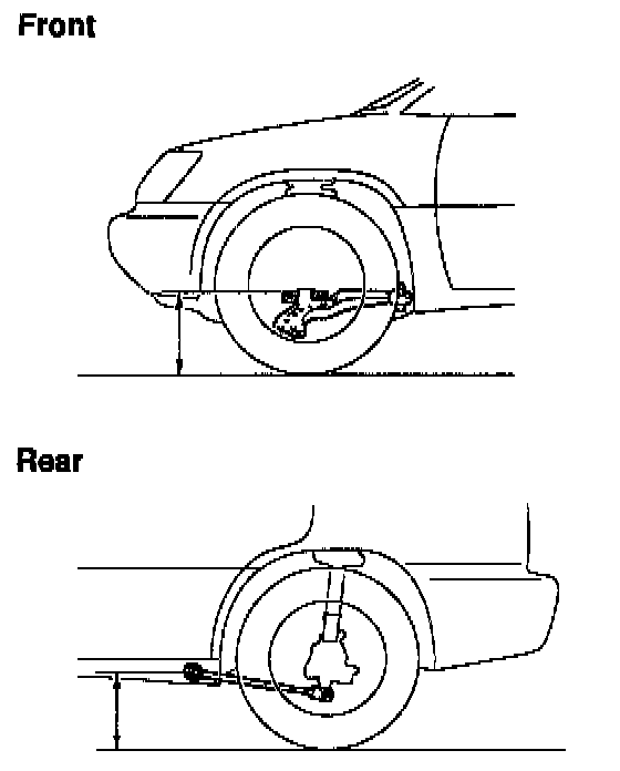 Measure the distance from the ground to the center of the front side lower suspension arm mounting bolt.