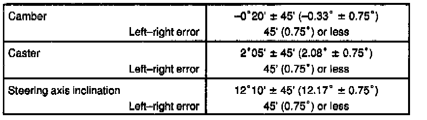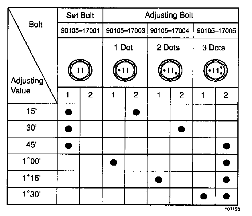 If the camber is not within the specification, using the table, estimate for how much additional camber adjustment will be required, and select the camber adjusting bolt.