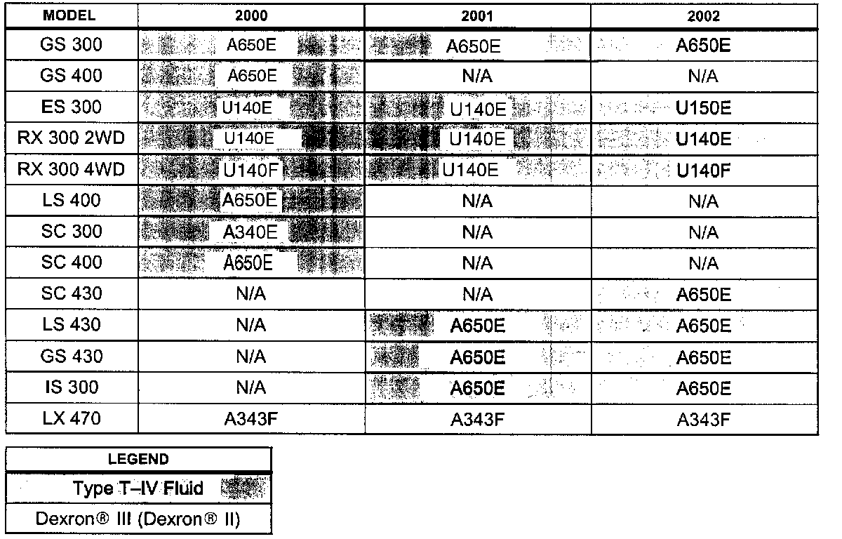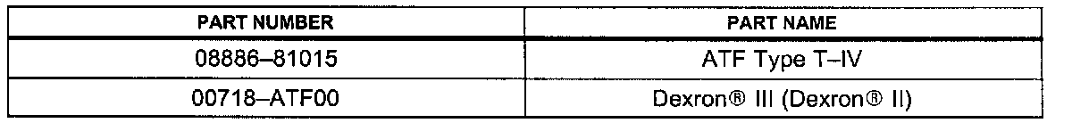 Please refer to the table shown for correct application of Dexron(R) II (Dexron(R) II) and Toyota Type T-IV Automatic Transmission Fluids or equivalent.