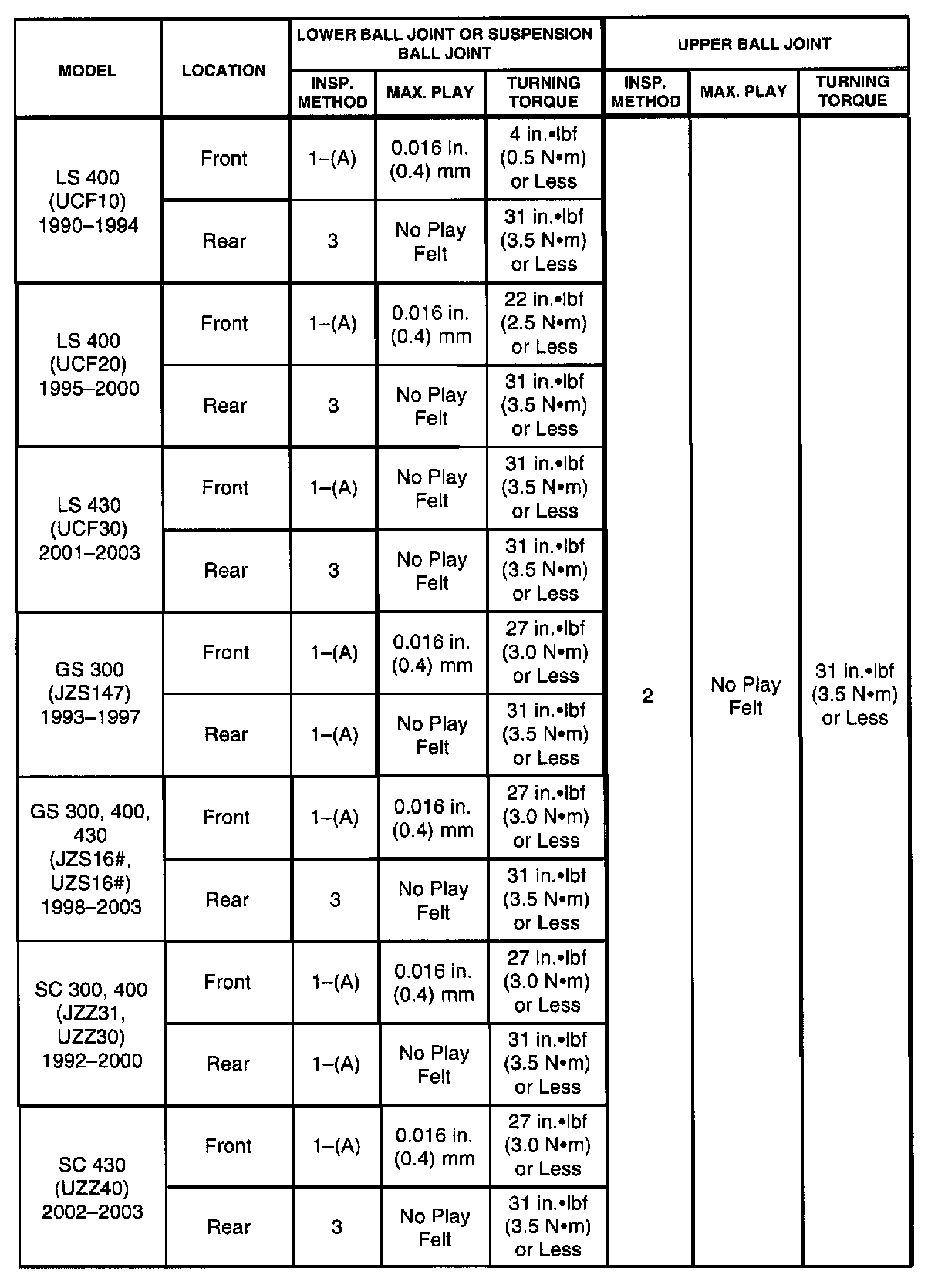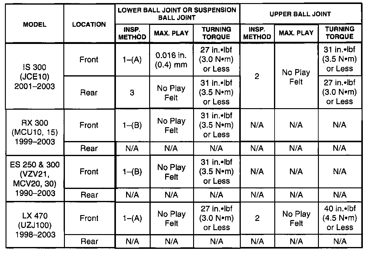 This Service Bulletin is to inform you of the inspection method, and free play specification figures for suspension ball joints. The on-vehicle inspection methods have been standardized.