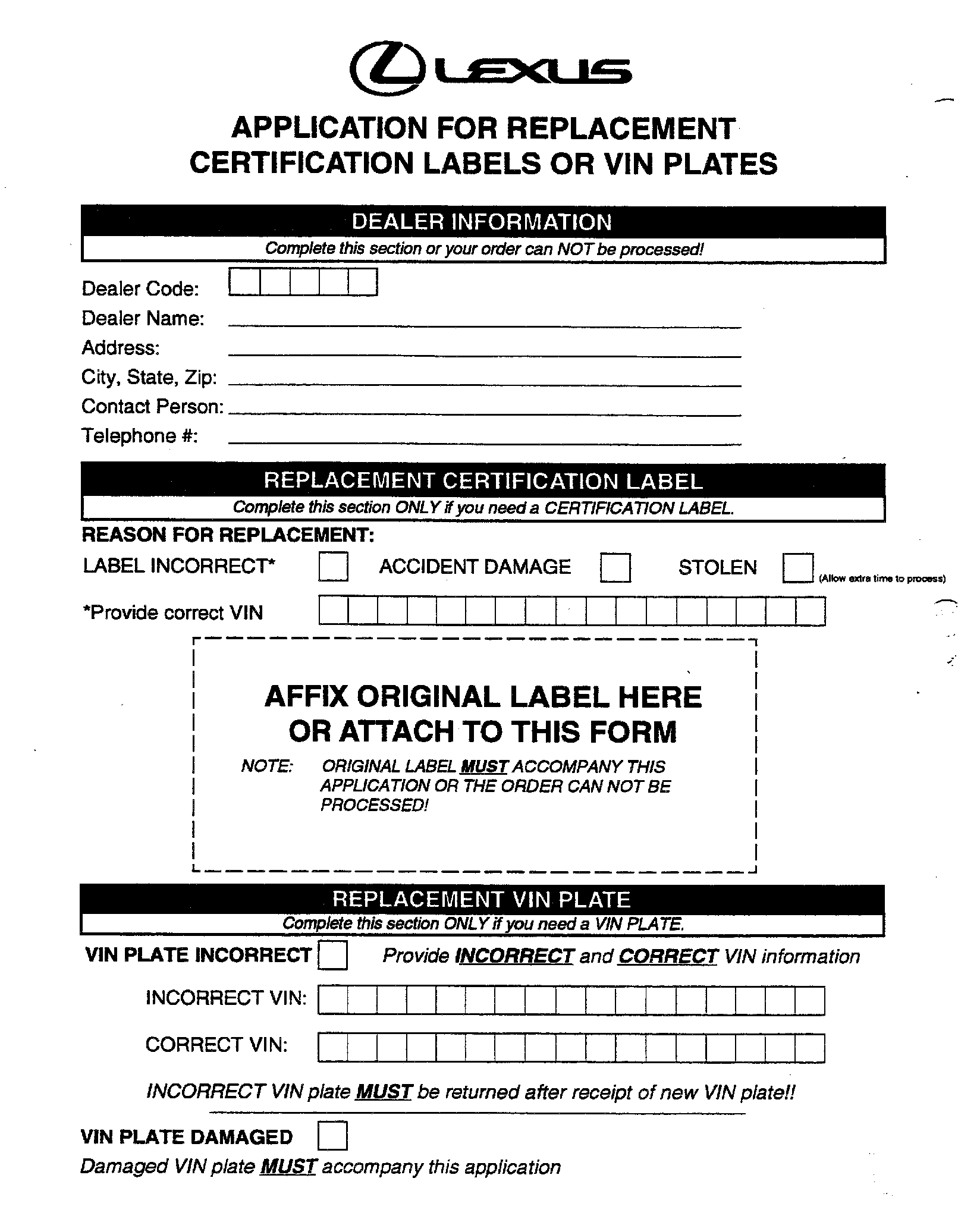 Replacement VIN plates (riveted to dashboard) and Certification Labels (affixed to driver's door or door post) are available from LEXUS providing the request meets one of the following criteria: