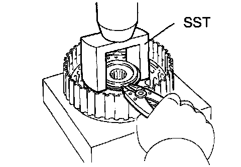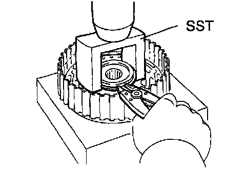 b. Place Special Service Tool (SST) on the return spring, and compress the return spring with a press.