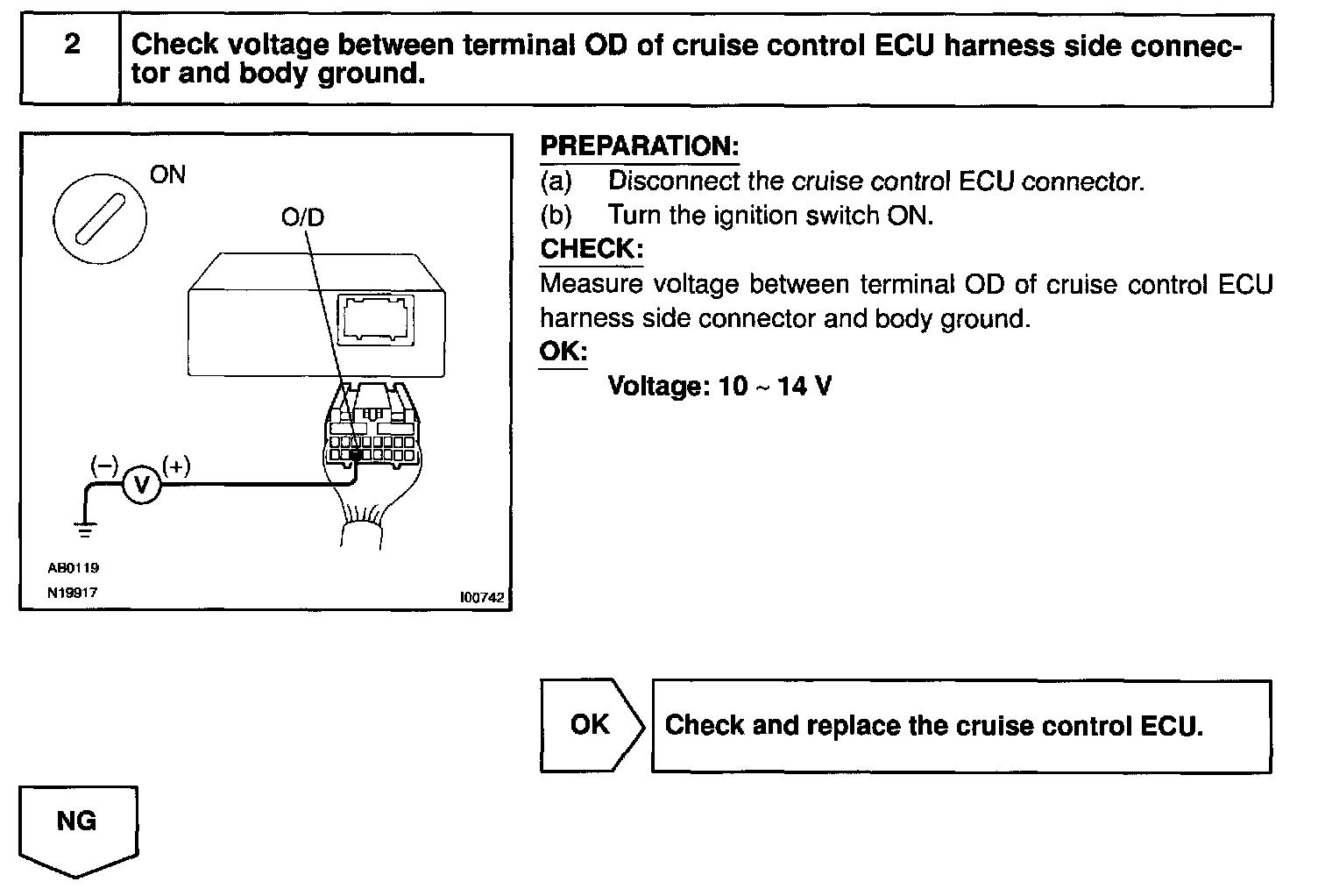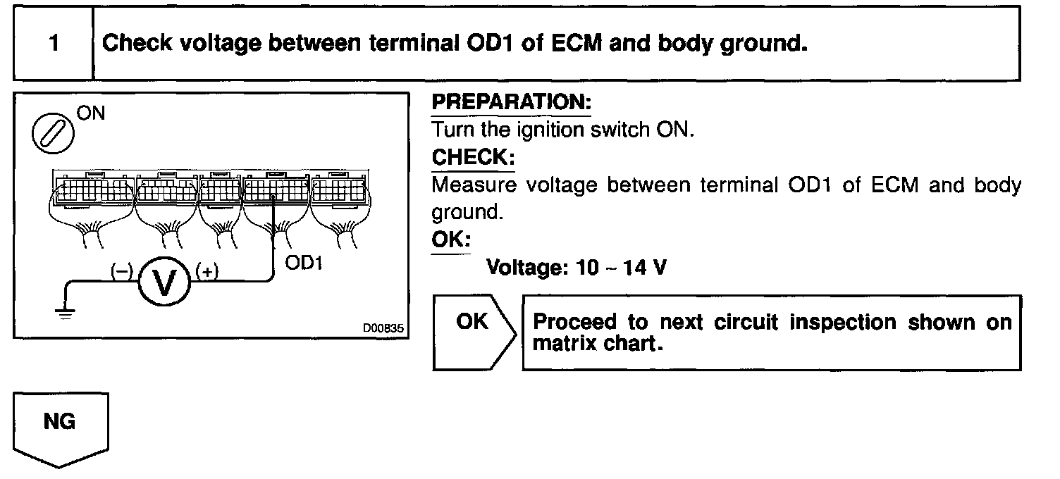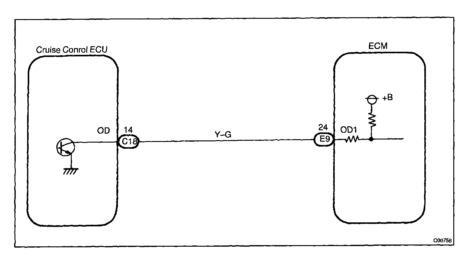 The cruise control ECU sends O/D cut signals to the ECM as necessary and the ECM cancels overdrive shifting until these signals are discontinued.