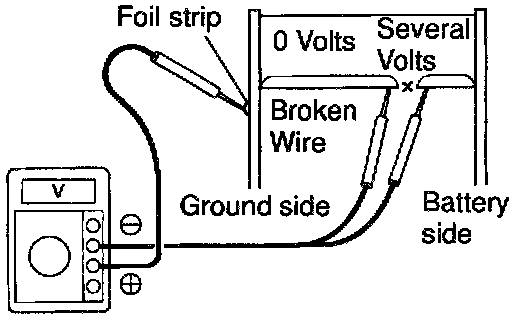 g. The point where the voltmeter deflects from several V to zero V is the place where the defogger wire is broken.