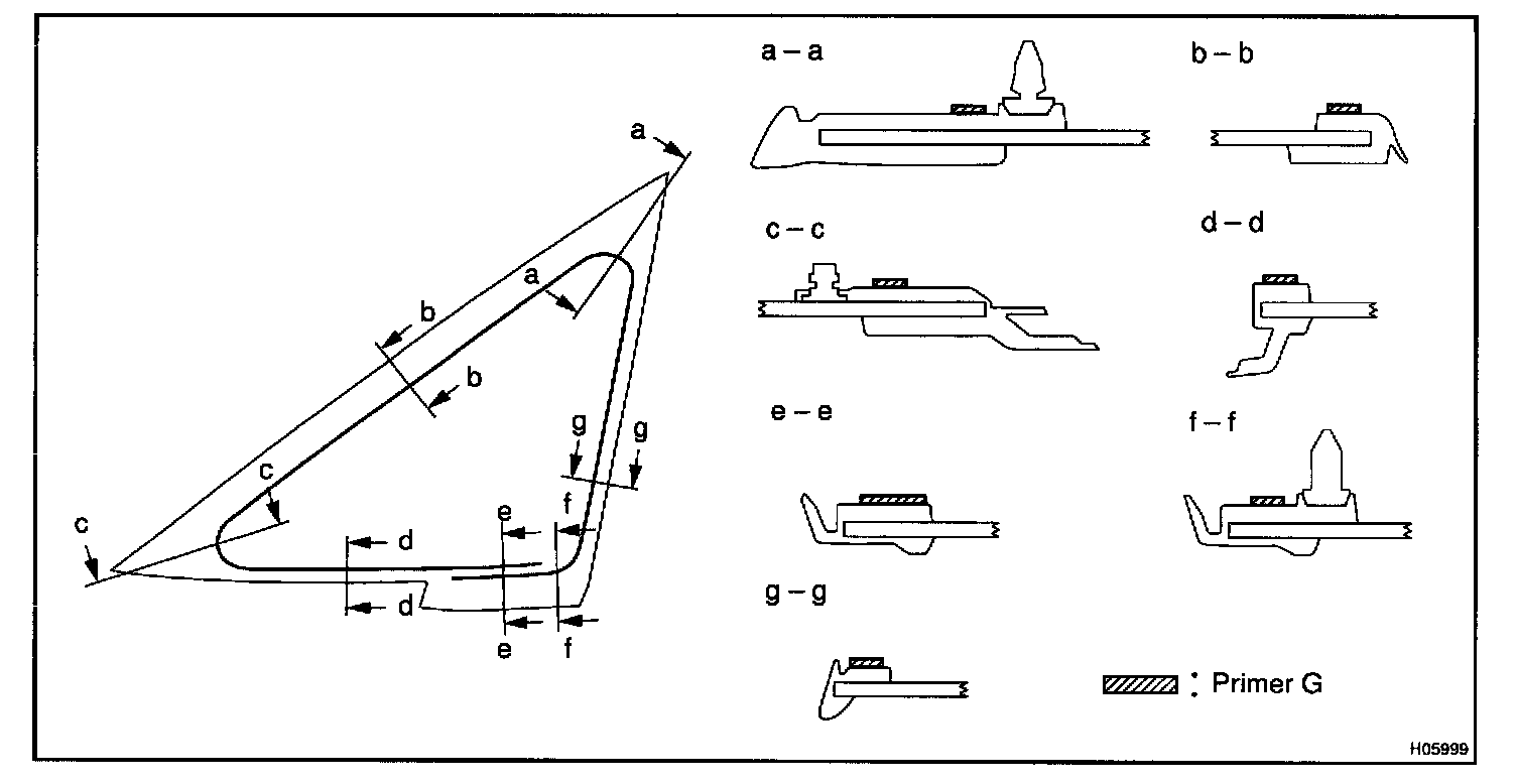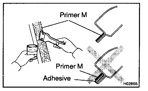 a. Using a brush or sponge, coat the edge of the glass and the contact surface with Primer G as shown in the illustration.
