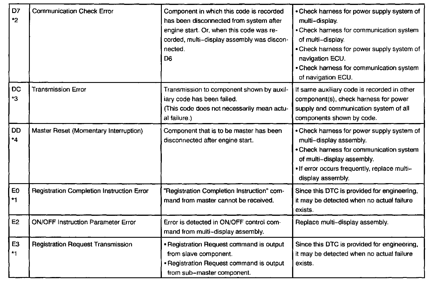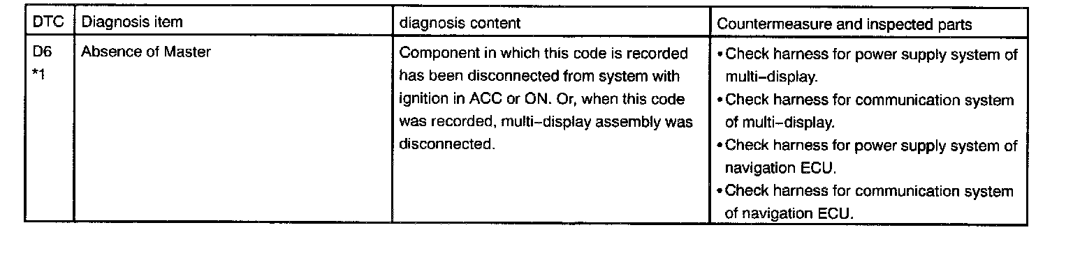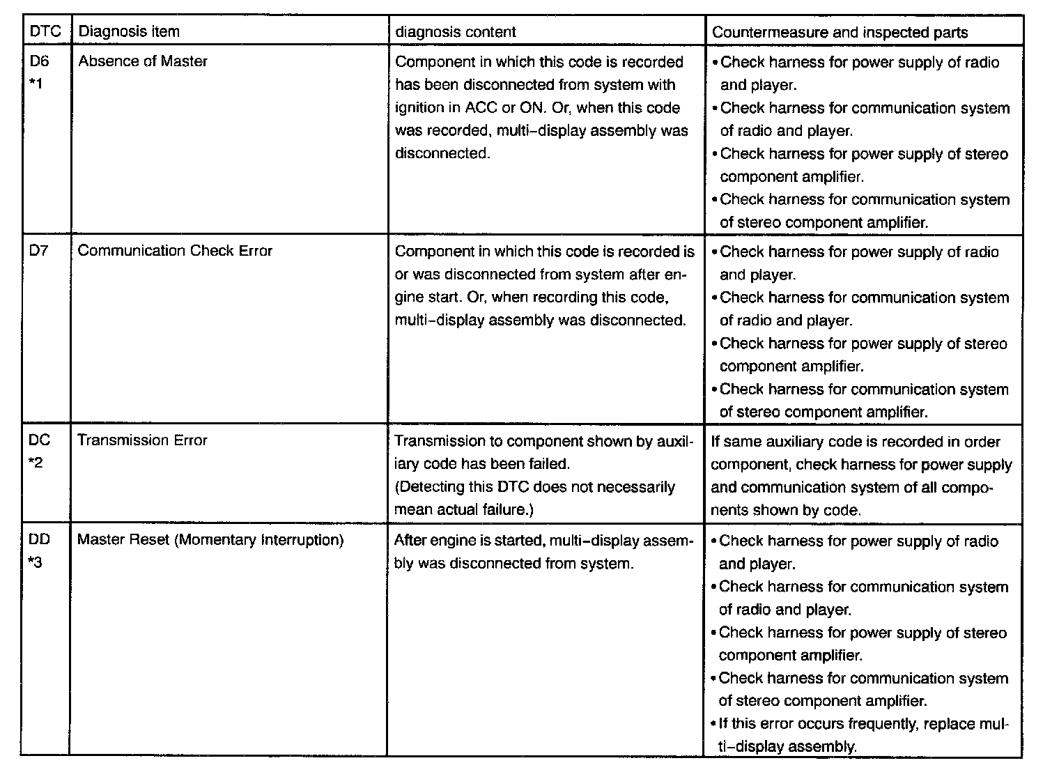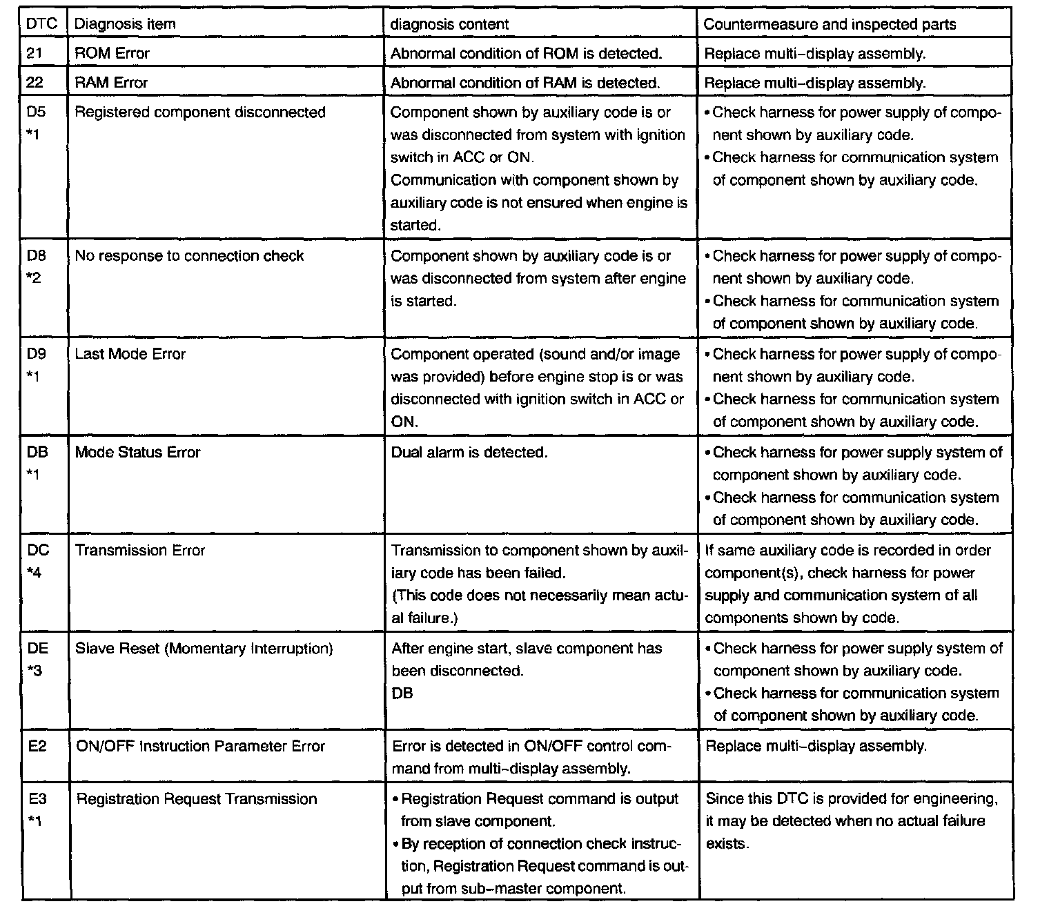 - *2: When 210 sec. has passed after pulling out the power supply connector of the master component with the ignition switch in ACC or ON, this code is stored.