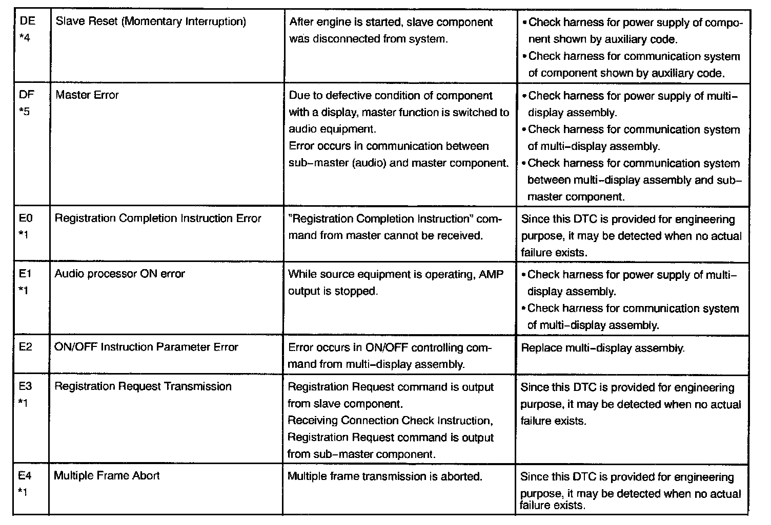 - *5: When 210 sec. has passed after pulling out the power supply connector of the master component with the ignition switch in ACC or ON, this code is stored.