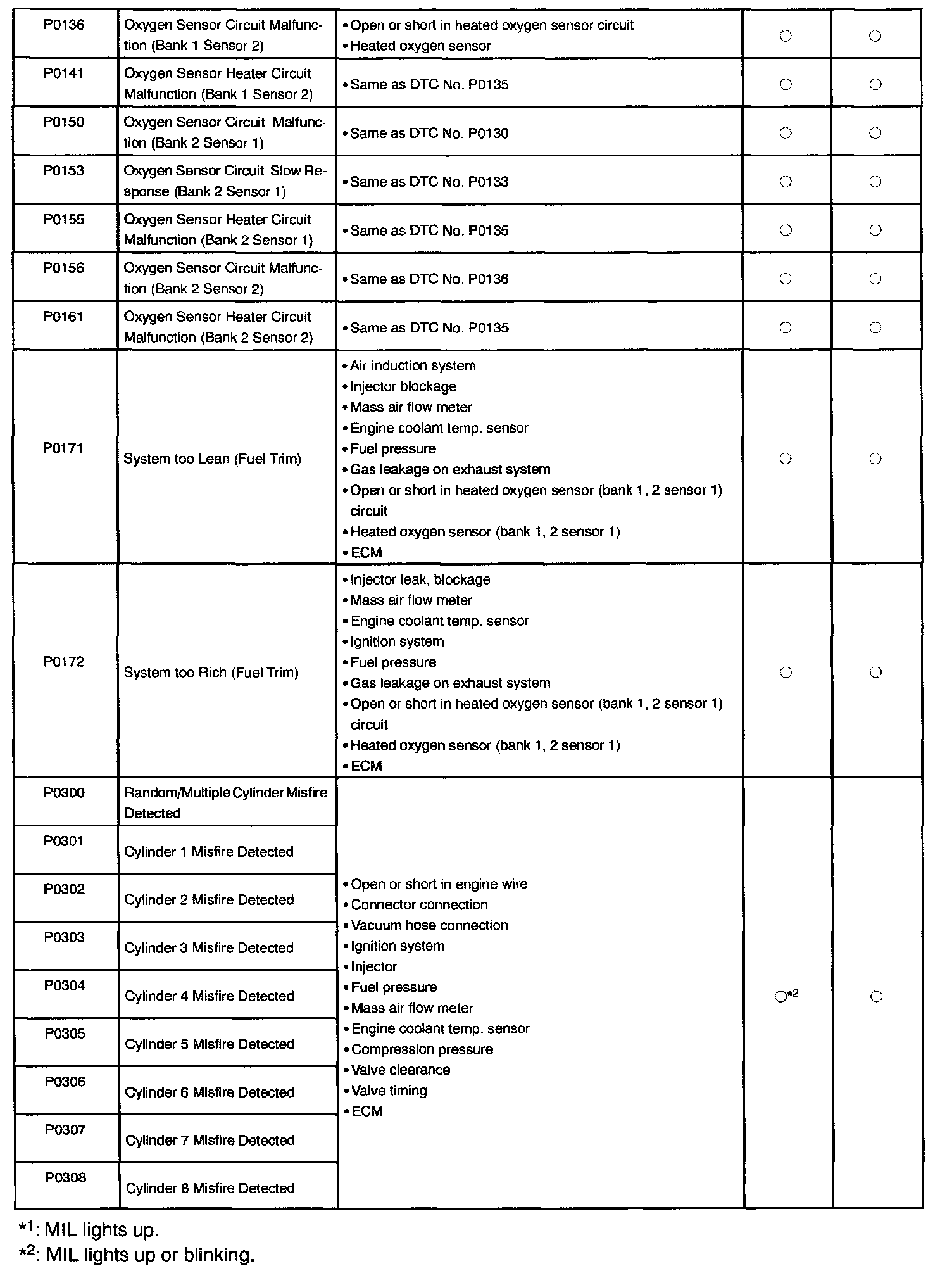 If a malfunction code is displayed during the DTC check in check mode, check the circuit for the codes listed in the table. For details of each code, refer to the respective "DTC No." under "Trouble Code Diagnostic Procedures".