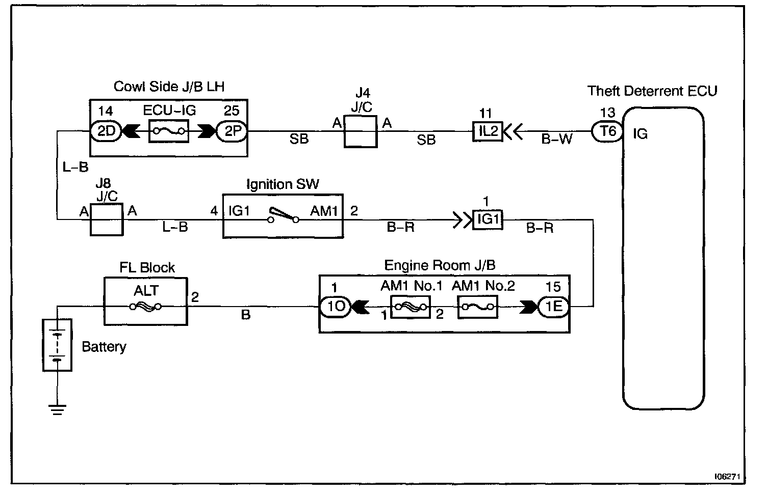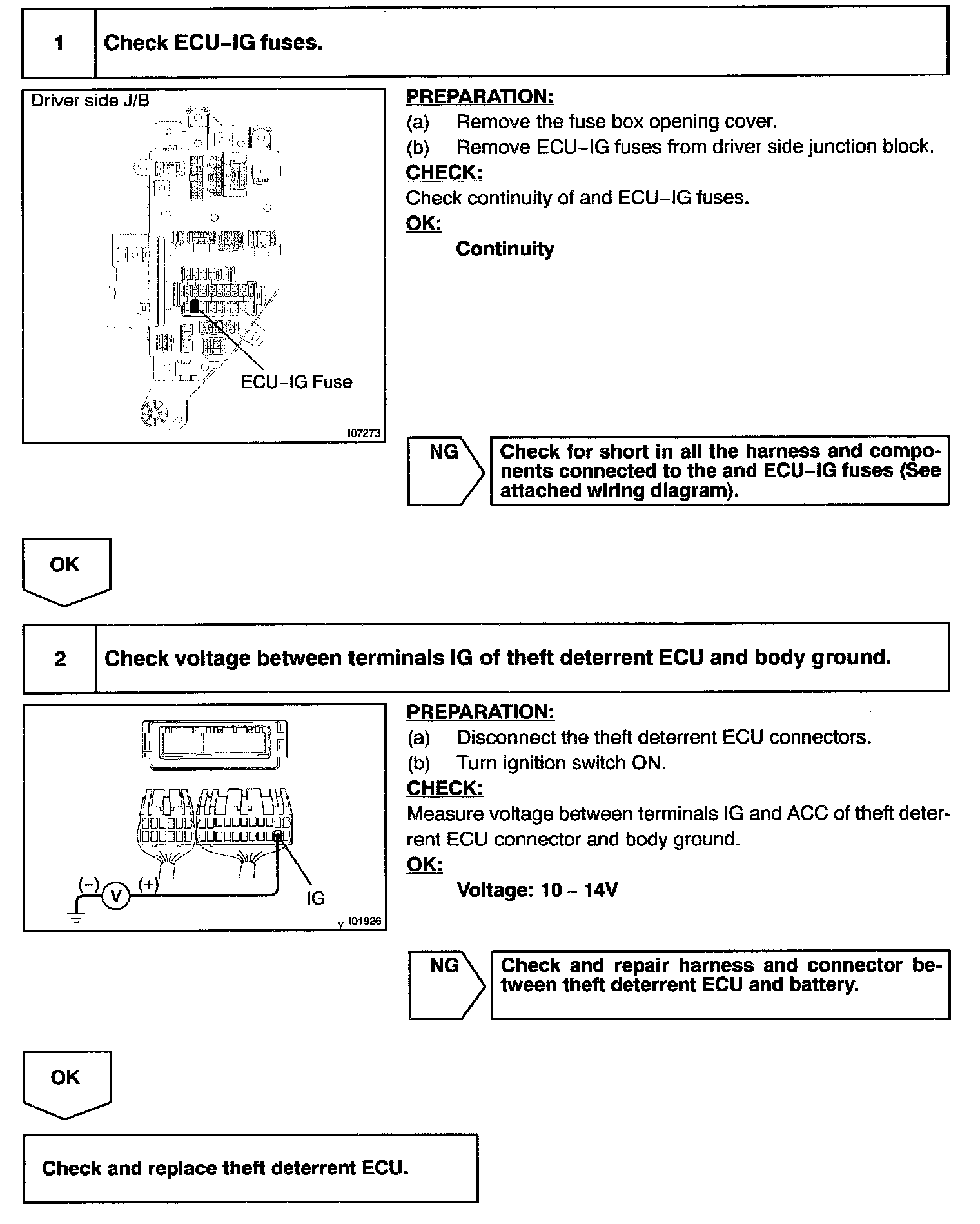 When the ignition switch is turned to the ACC position, battery positive voltage is applied to the terminal ACC of the ECU. Also, it the ignition switch is turned to the ON position, battery positive voltage is applied to the terminals ACC and IG of the ECU. When the battery positive voltage is applied to the terminal ACC of the ECU while the theft deterrent system is activated, the warning stops. Furthermore, power supplied from the terminals ACC and IG of the ECU is used as power for the door courtesy switch, and position switch, etc.