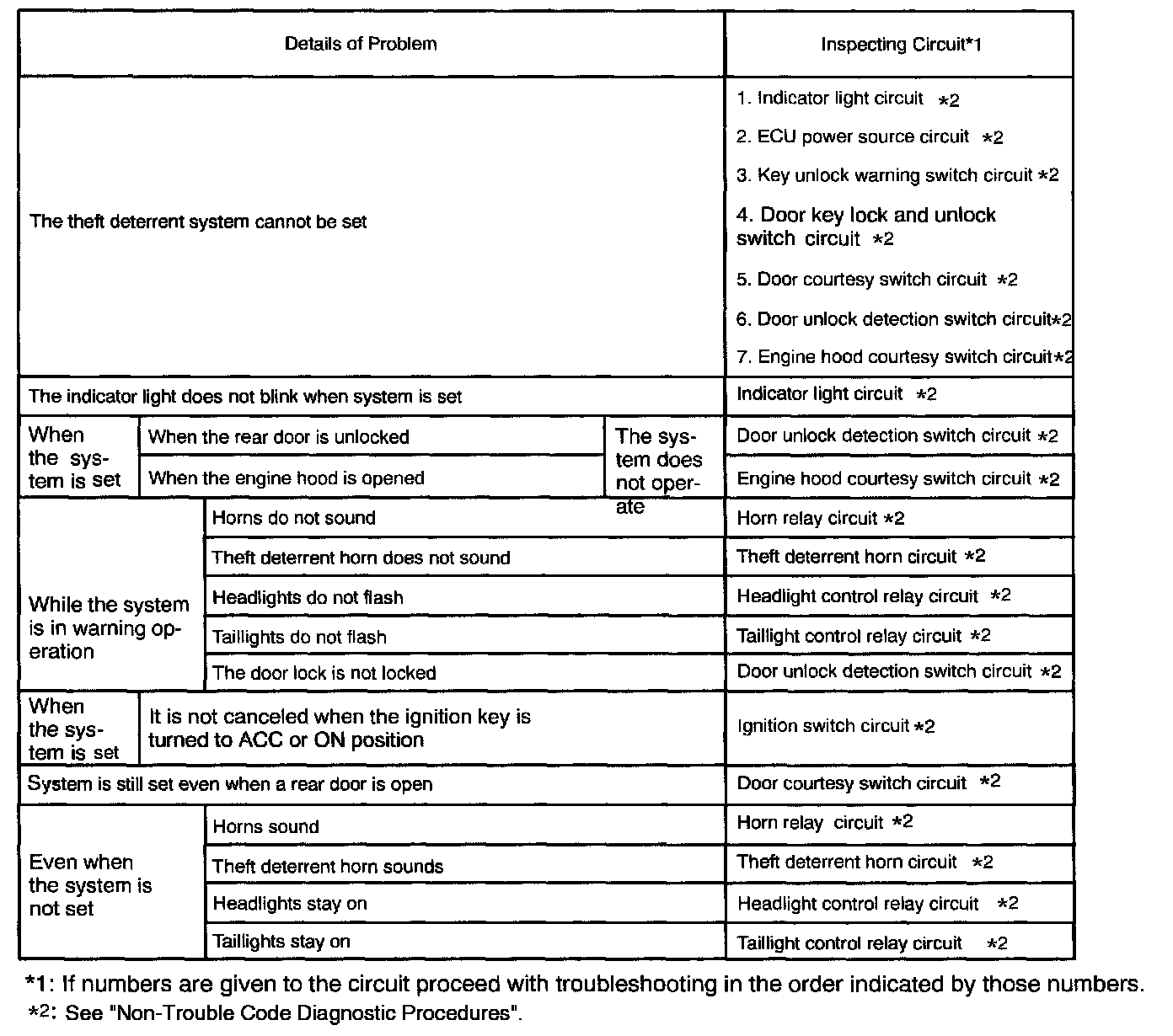 HINT: Troubleshooting of the theft deterrent system is based on the premise that the door lock control system is operating normally. Accordingly, before troubleshooting the theft deterrent system, first make certain that the door lock control system is operating normally.