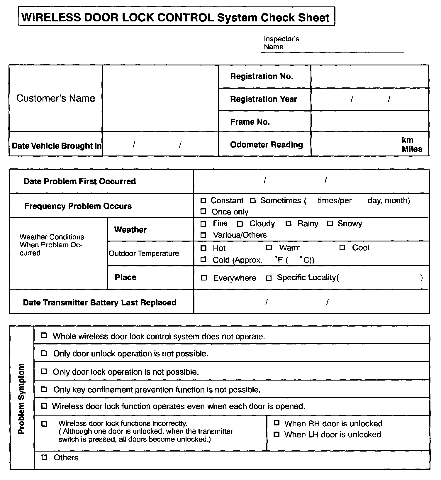 Wireless Door Lock Control System Check Sheet: