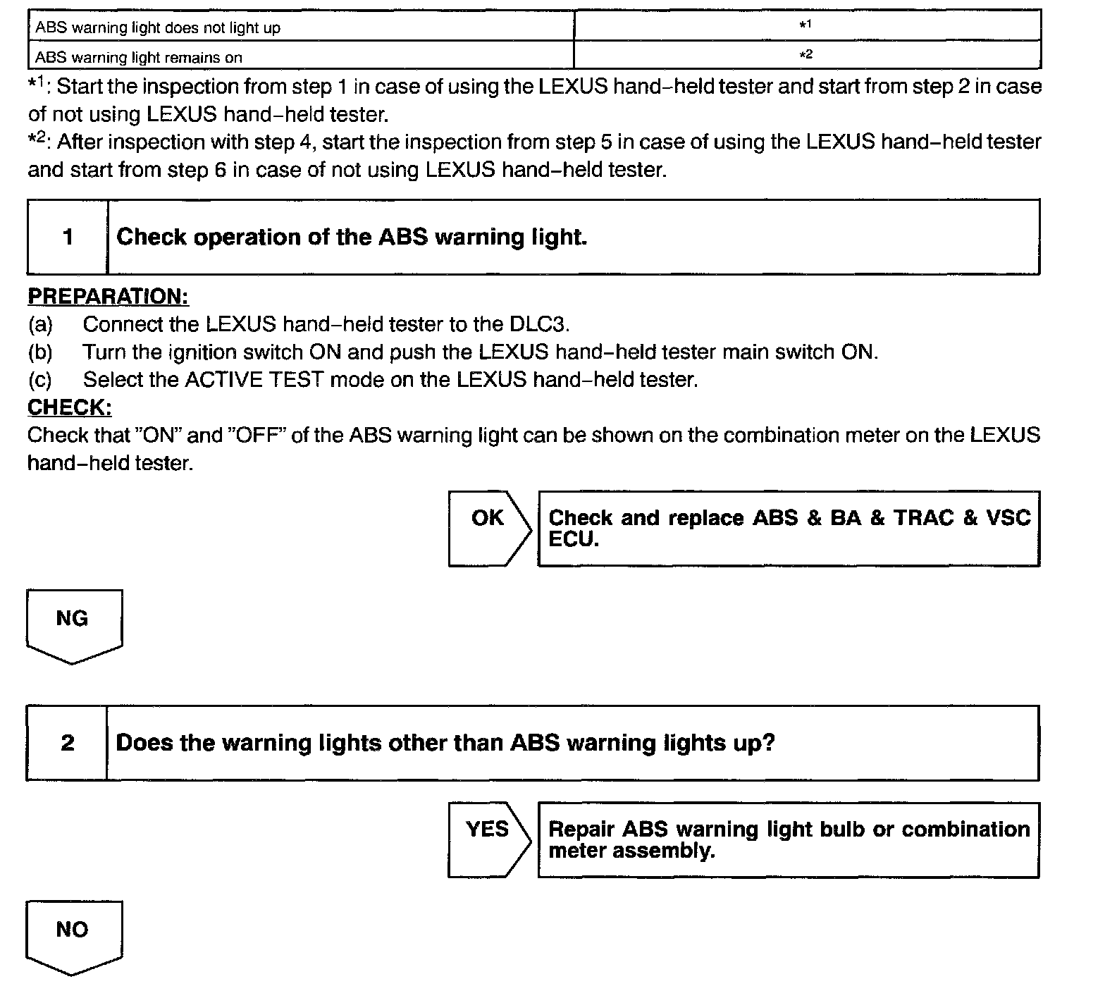 It the ECU detects trouble, it lights the ABS warning light while at the same time prohibiting ABS control. At this time, the ECU records a DTC in memory.