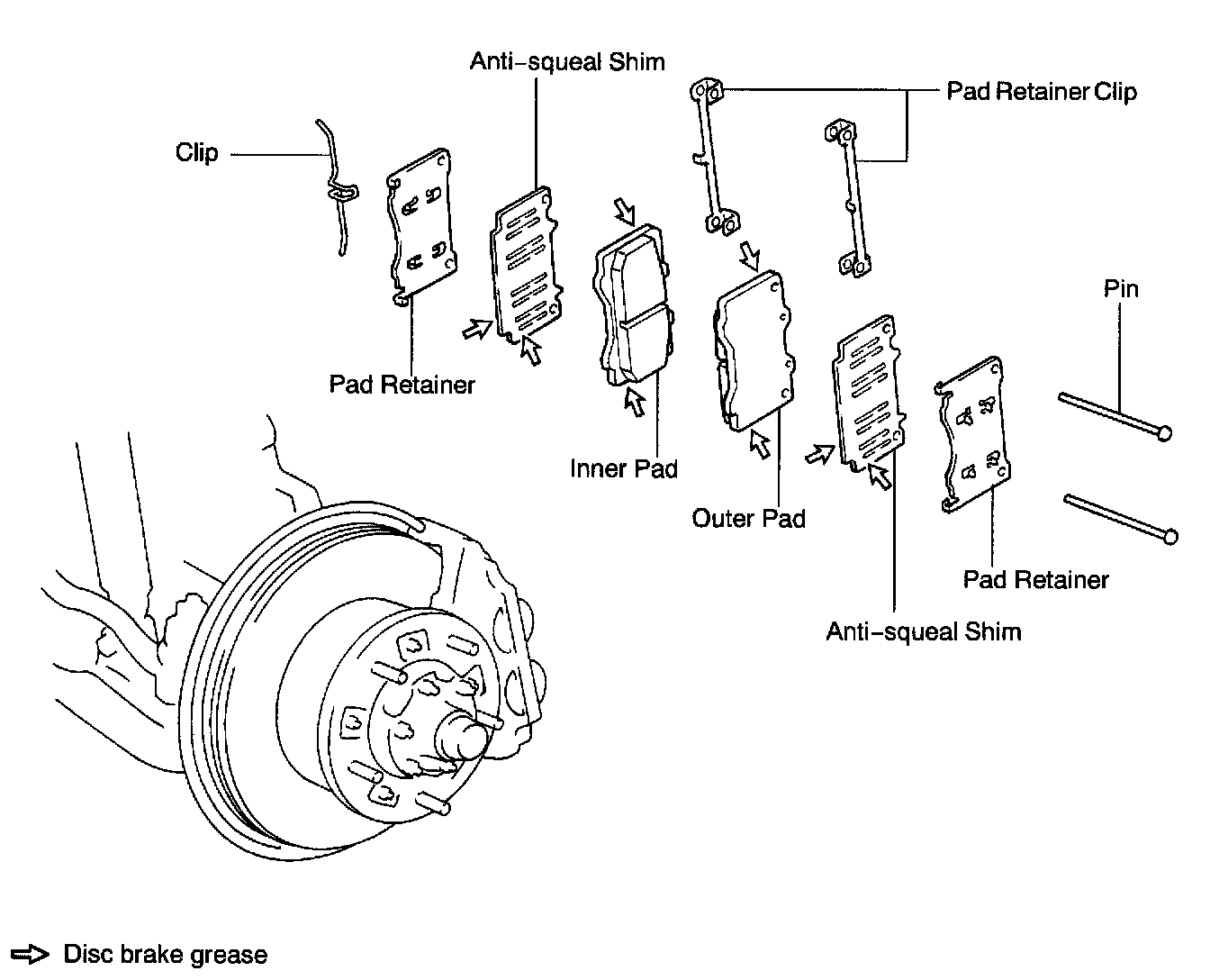 HINT: Apply disc brake grease to the pads indicated by the arrows.
