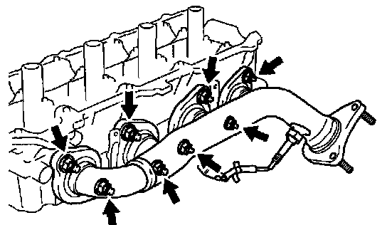 b. Install the 4 nuts holding the water bypass joint to the cylinder heads. Alternately tighten the nuts.