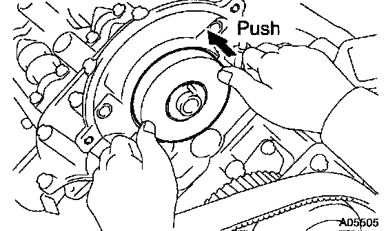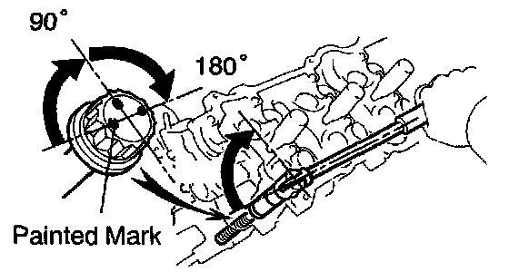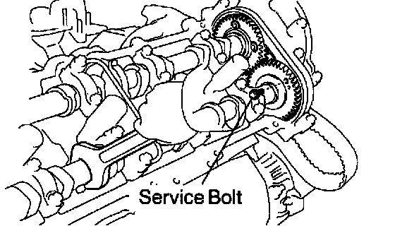 12. Boring the service bolt installed in the driven sub gear upward by turning the hexagon wrench head portion of the camshaft with a wrench.
