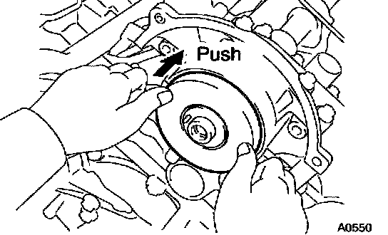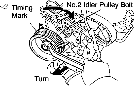 Turn the crankshaft pulley clockwise or counterclockwise, and put the timing mark of the crankshaft pulley in line with the centers of the crankshaft pulley bolt and idler pulley bolt.