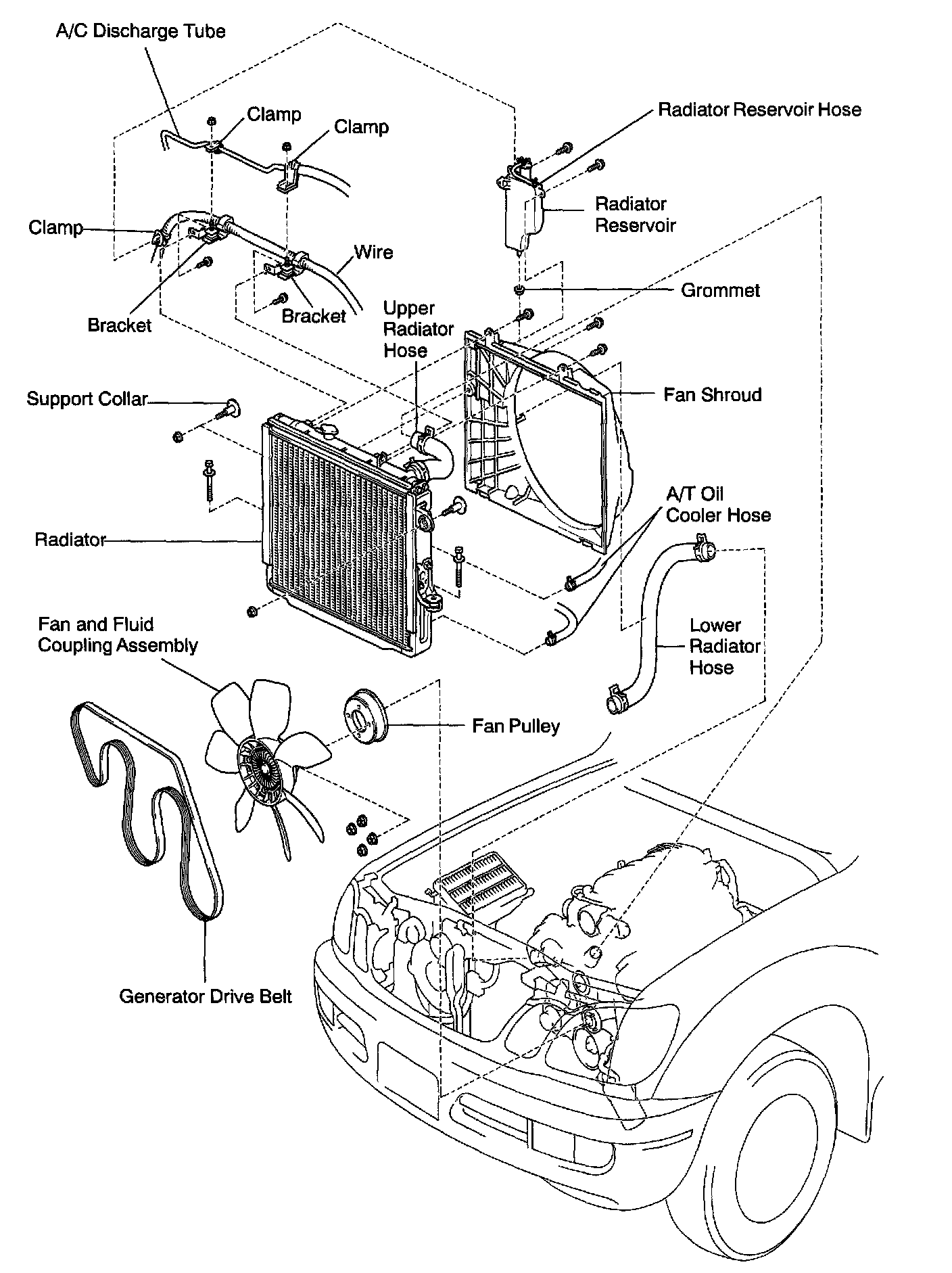 f. Disconnect the 2 A/T oil cooler hoses from the radiator.