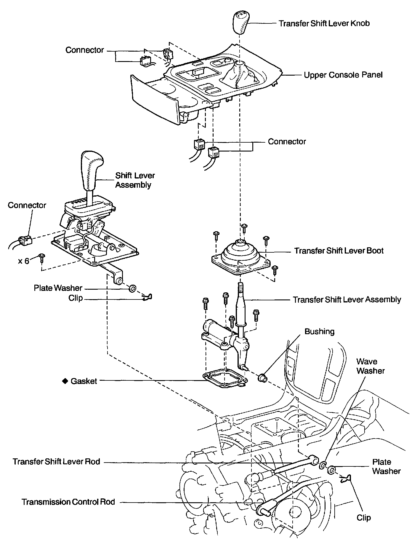 1. Remove the clip, plate washer and wave washer, and disconnect the transfer rod from the shift lever.