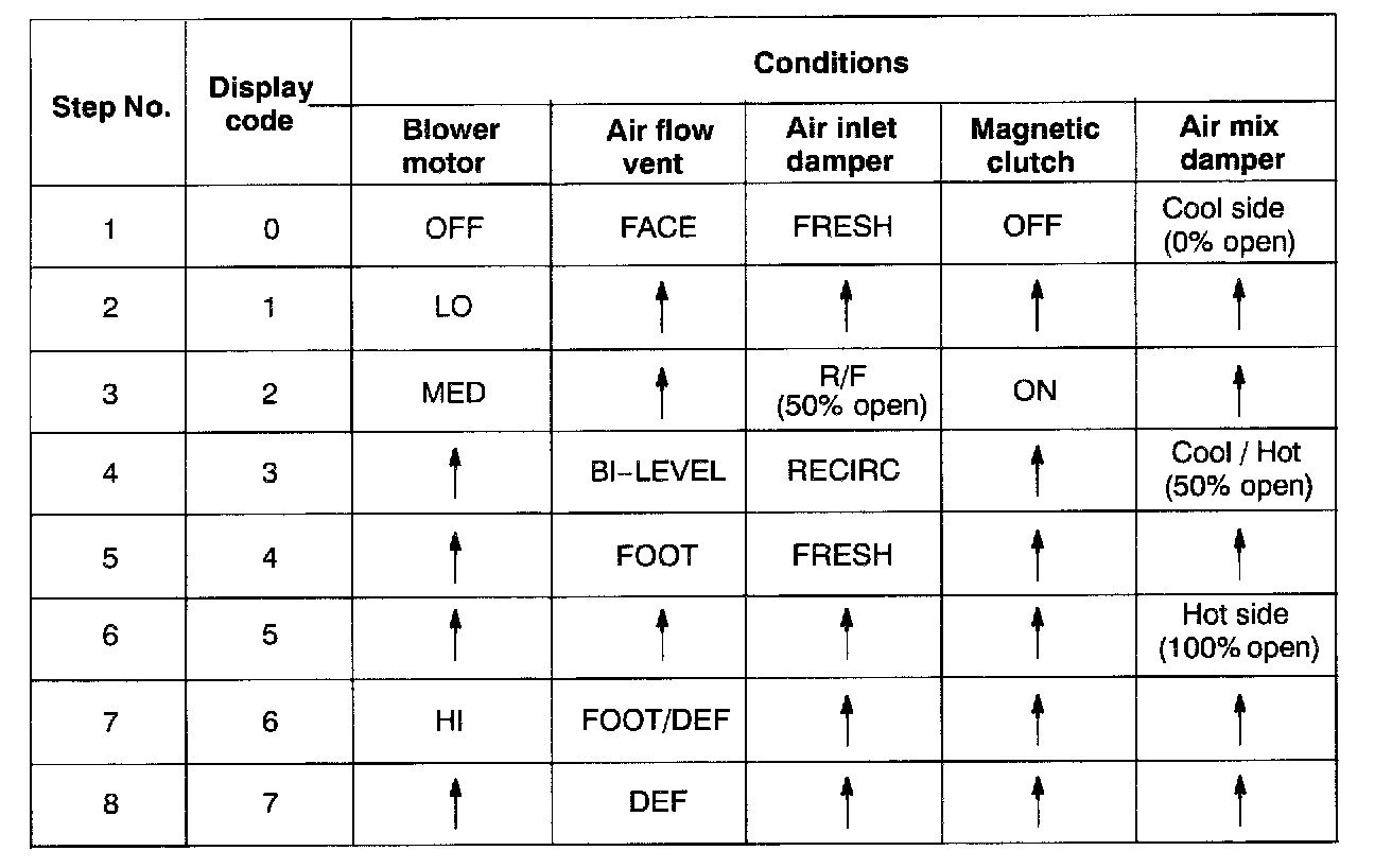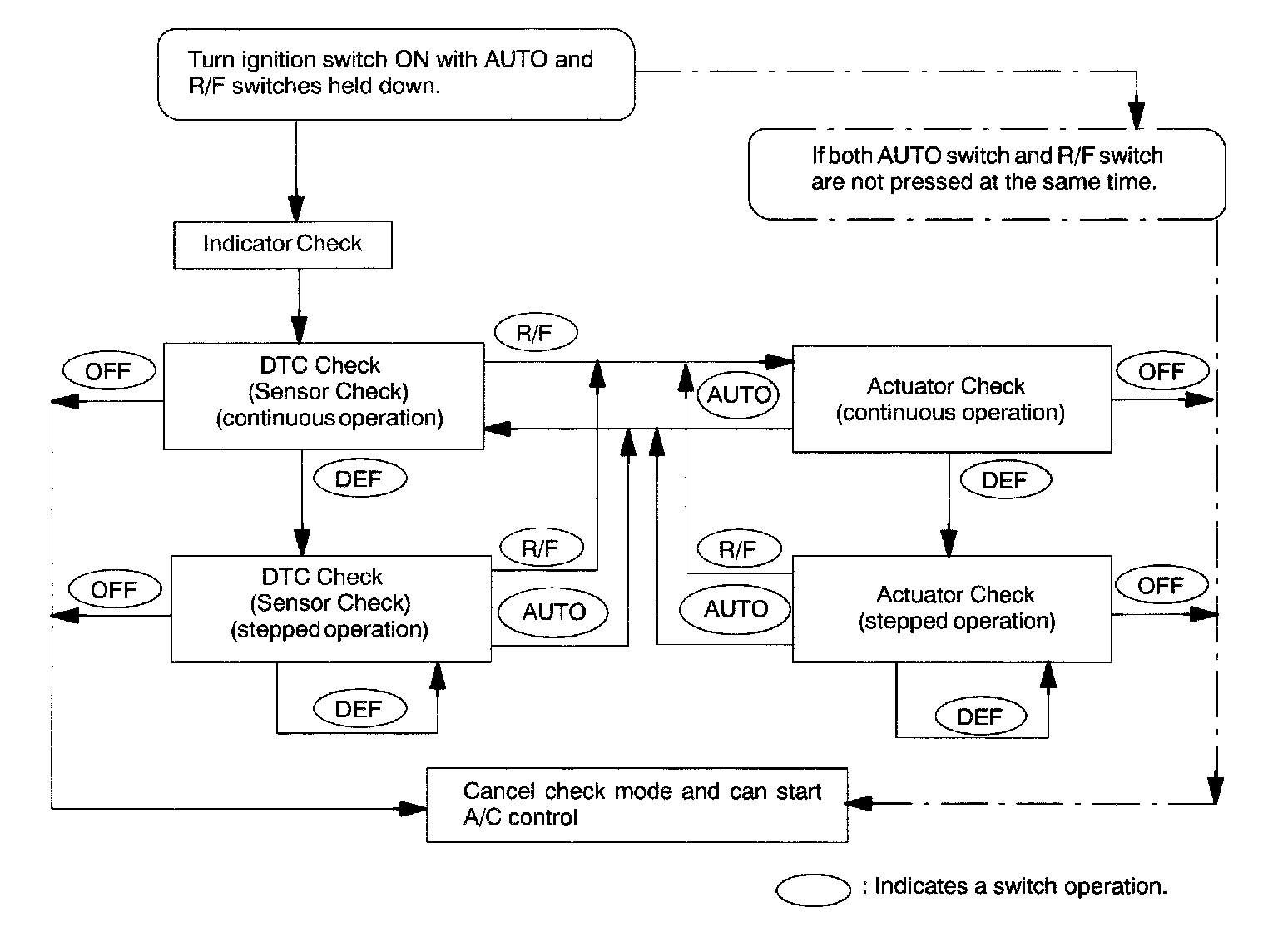 By operating each of the A/C control switches as shown in the diagram, it is possible to enter the diagnosis check mode.