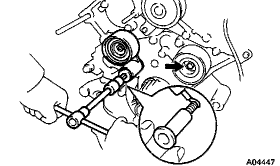 - Do not utilize timing belt tension when installing or re moving the mount bolt of the camshaft timing pulley.