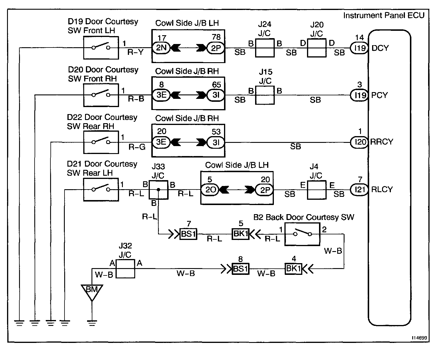 The door courtesy switch goes on when the door is opened and goes off when door is closed.