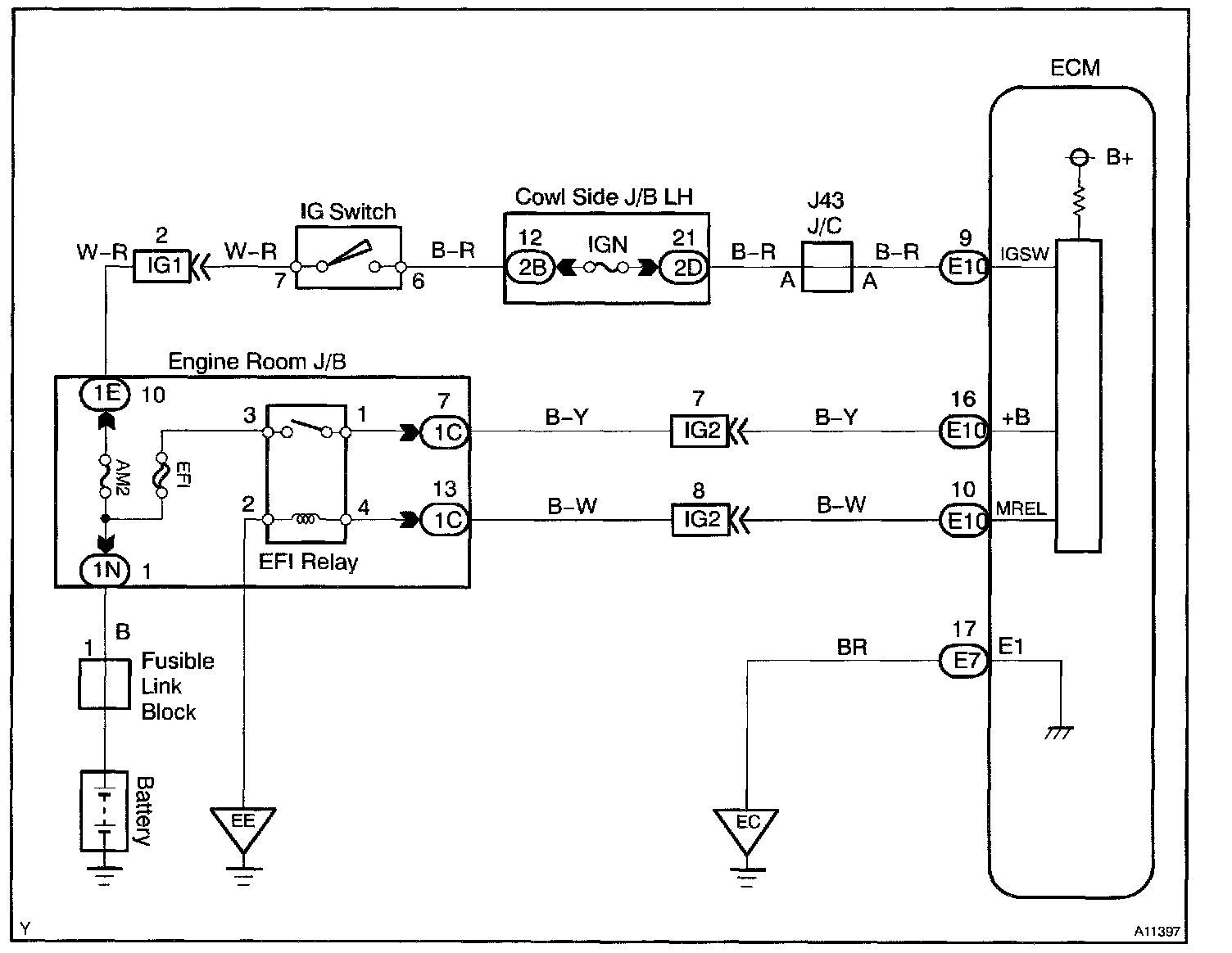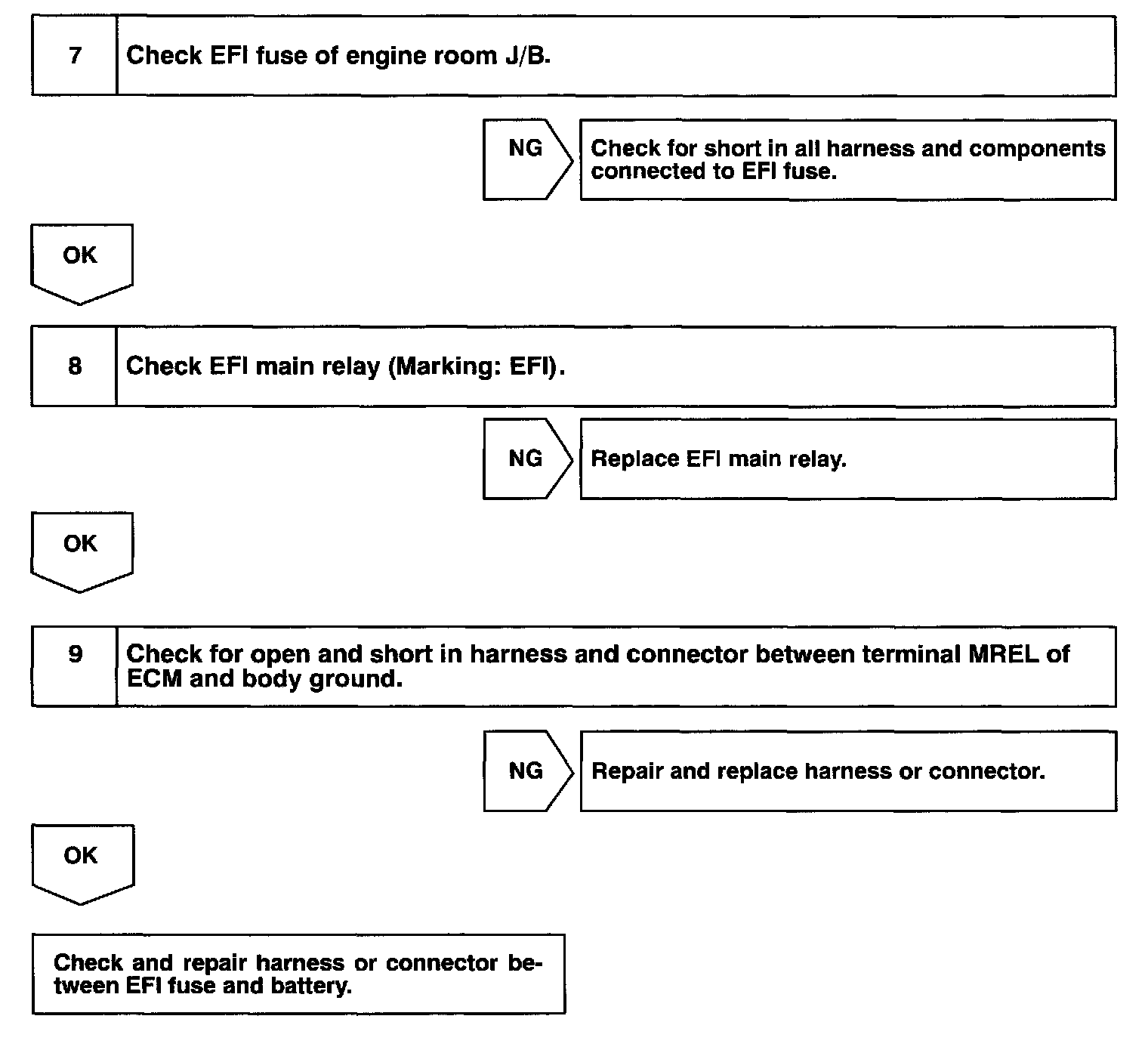 When the ignition switch is turned ON, battery positive voltage is applied to terminal IGSW of the ECM and the EFI main relay (Marking: EFI) control circuit in the ECM sends a signal to terminal MREL of the ECM switching on the EFI main relay.