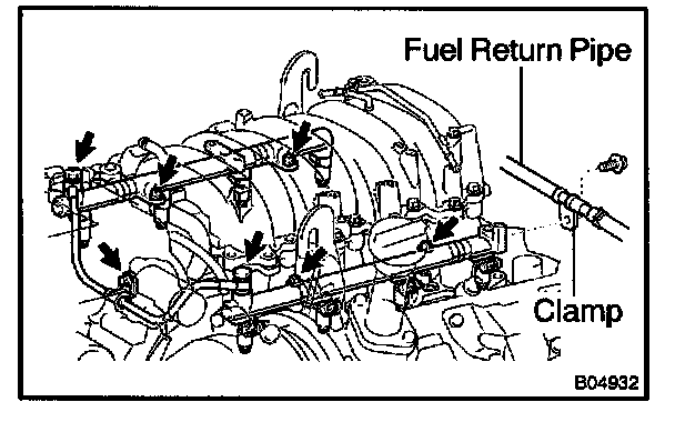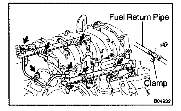 i. Install the bolt holding the clamp on the fuel return pipe to the LH delivery pipe.
