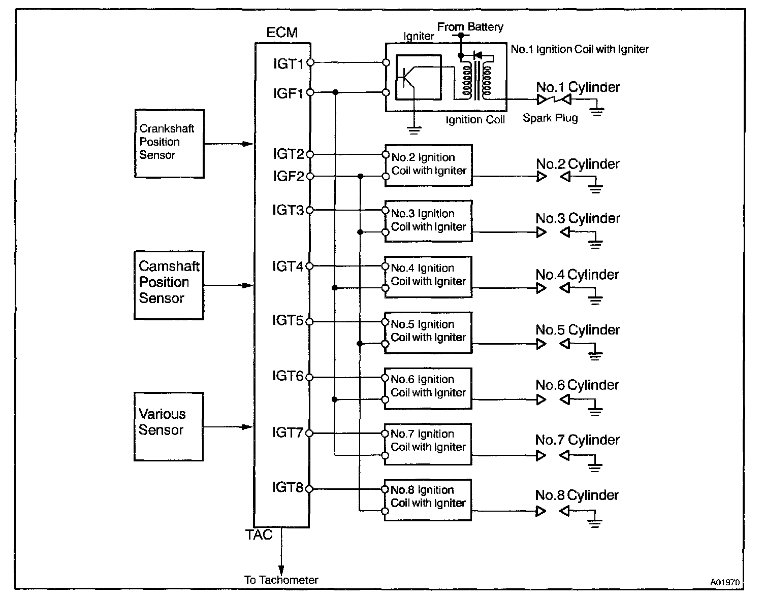 The ECM determines ignition timing and outputs the ignition signals (IGT) for each cylinder. Based on IGT signals, the power transistors in the igniter cuts off the current to the primary coil in the ignition coil is supplied to the spark plug that are connected to the end of the secondary coil. At the same time, the igniter also sends an ignition confirmation signal (IGF) as a fail-safe measure to the ECM.