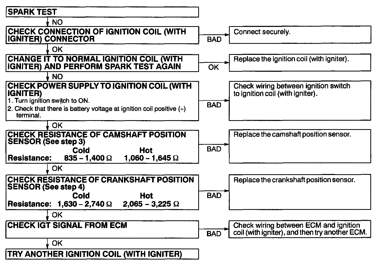 If the resistance is not as specified, replace the crankshaft position sensor.