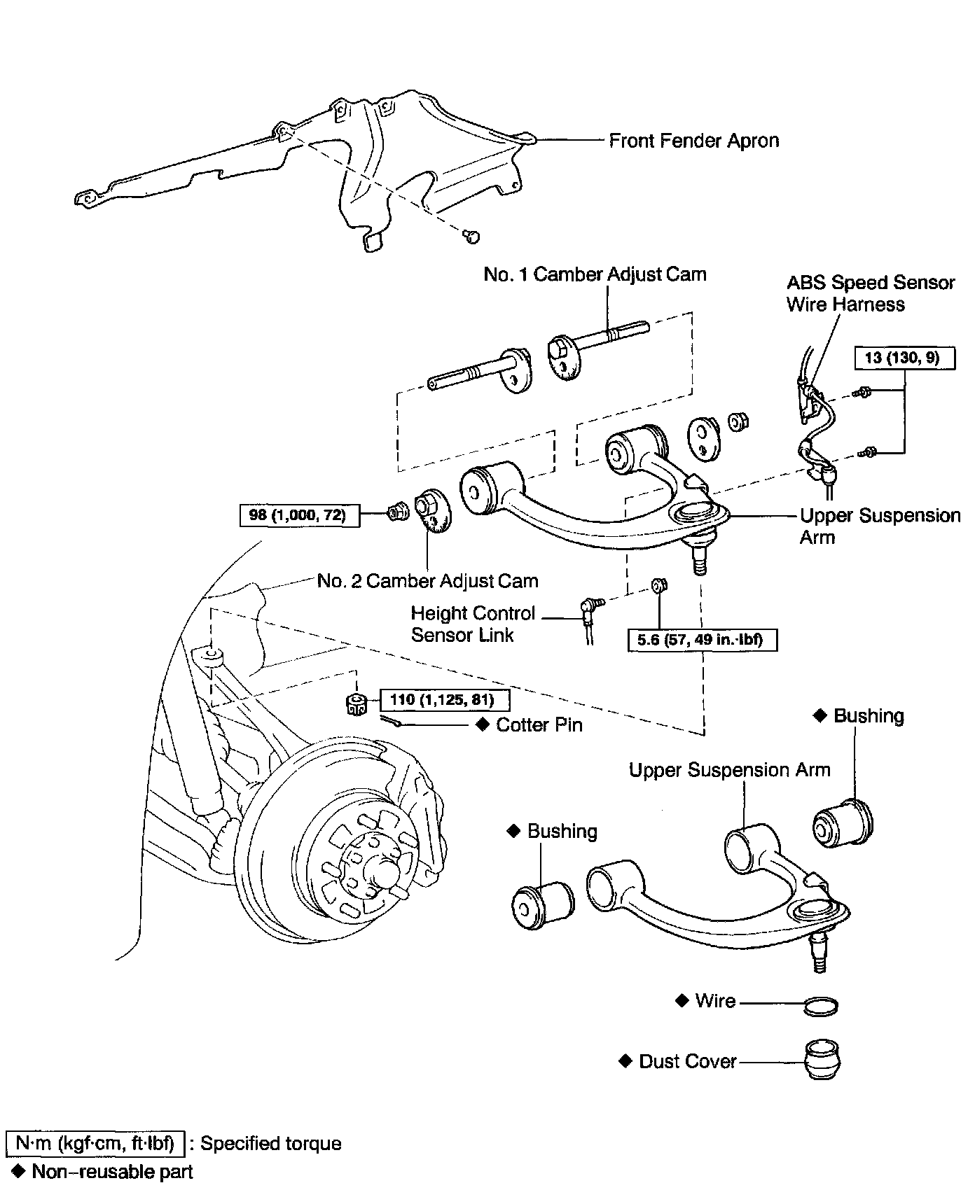 b. Remove the 2 nuts, No. 1 and No. 2 camber adjust cams and upper suspension arm.