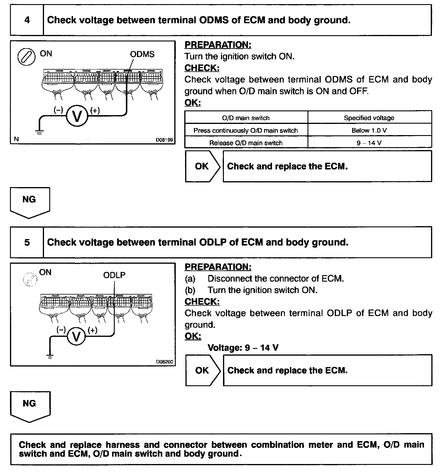 The O/D main switch is a momentary type switch. When pressing the O/D OFF main switch, the O/D OFF indicator light lights up and ECM prohibits shifting to O/D, and when pressing it again, the O/D OFF indicator light goes off and ECM allows shifting to O/D. Turning the IG switch OFF will reset the O/D OFF indicator light.