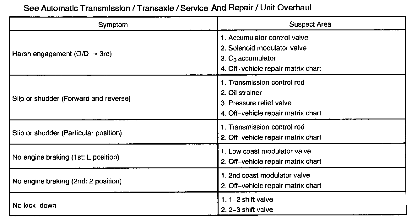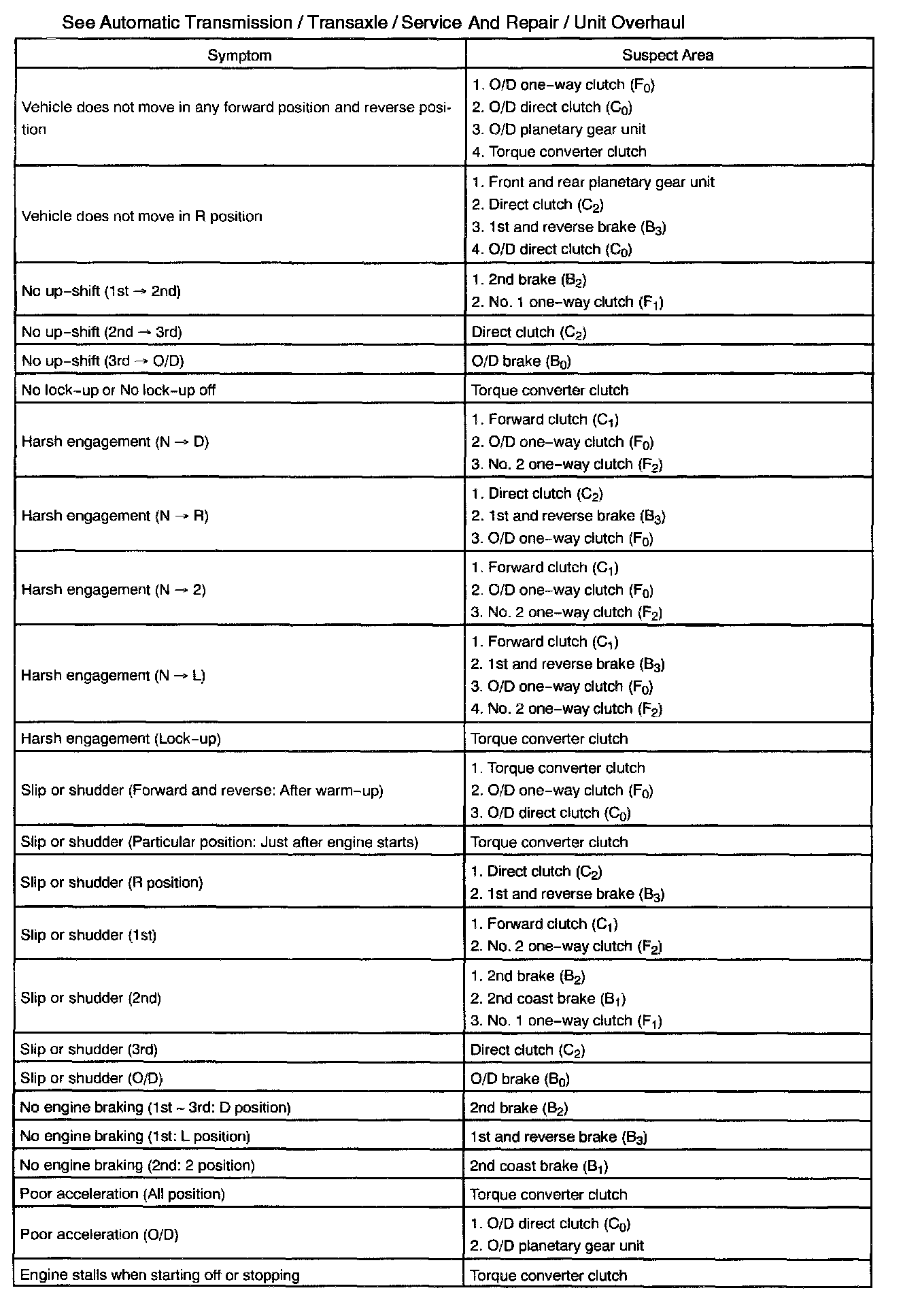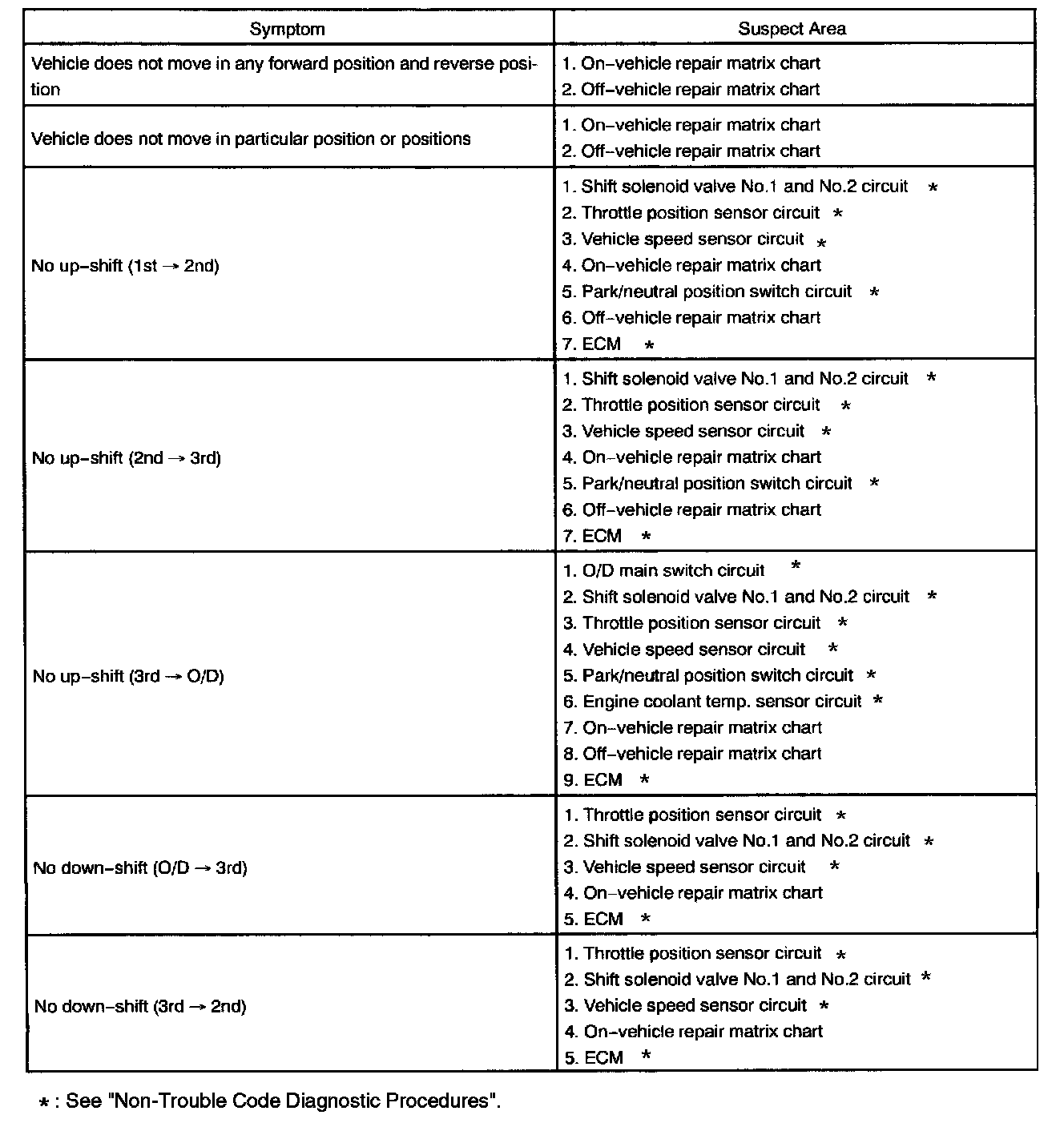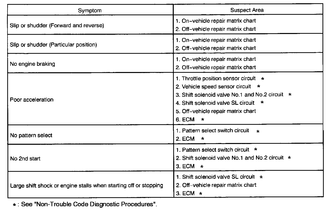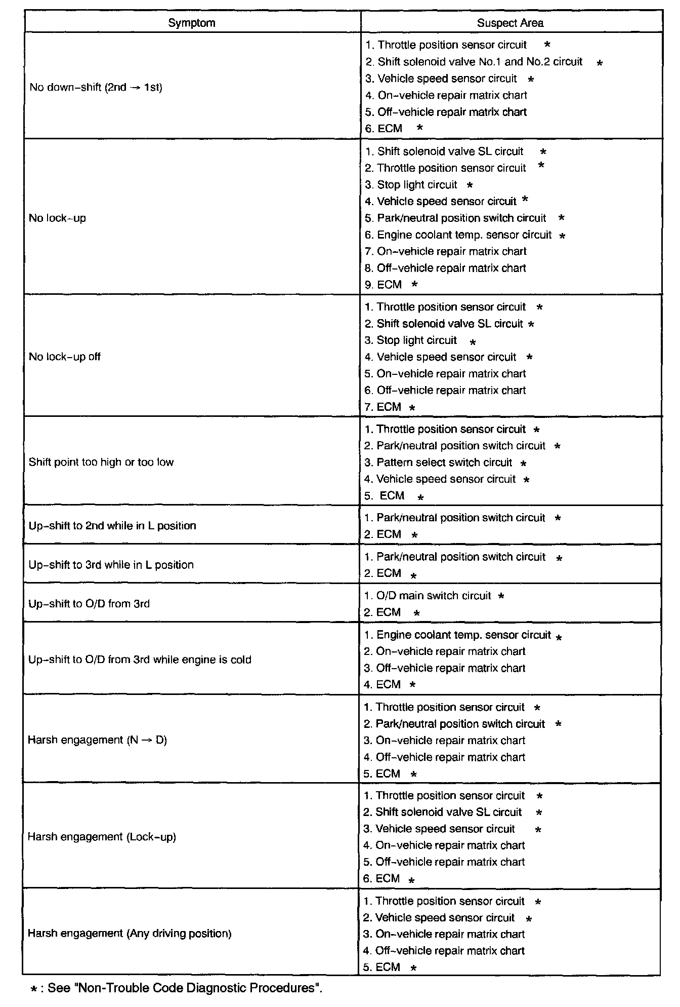 PROBLEM SYMPTOMS TABLEIf a normal code is displayed during the diagnostic trouble code check but the trouble still occurs, check the circuits for each symptom in the order given in the charts and proceed to the appropriate troubleshooting.