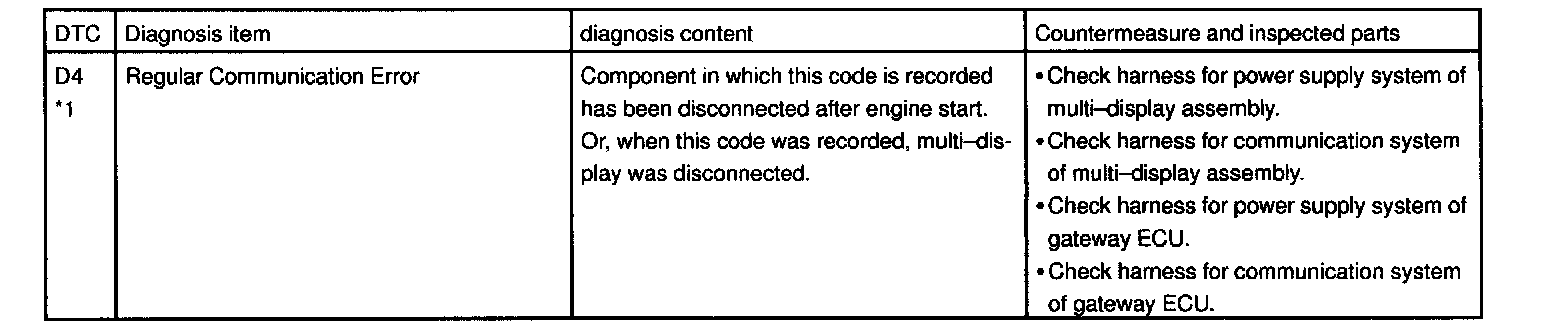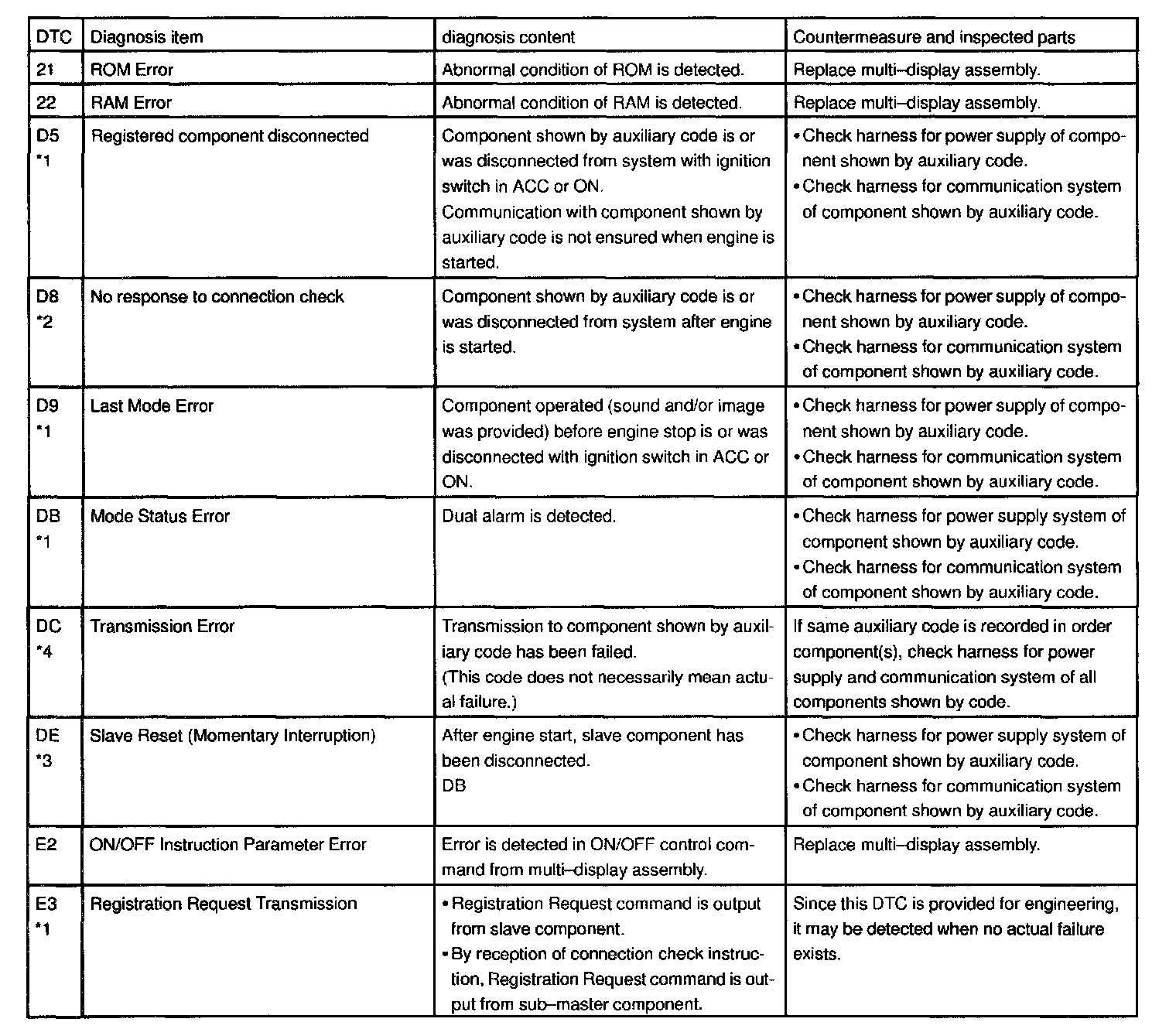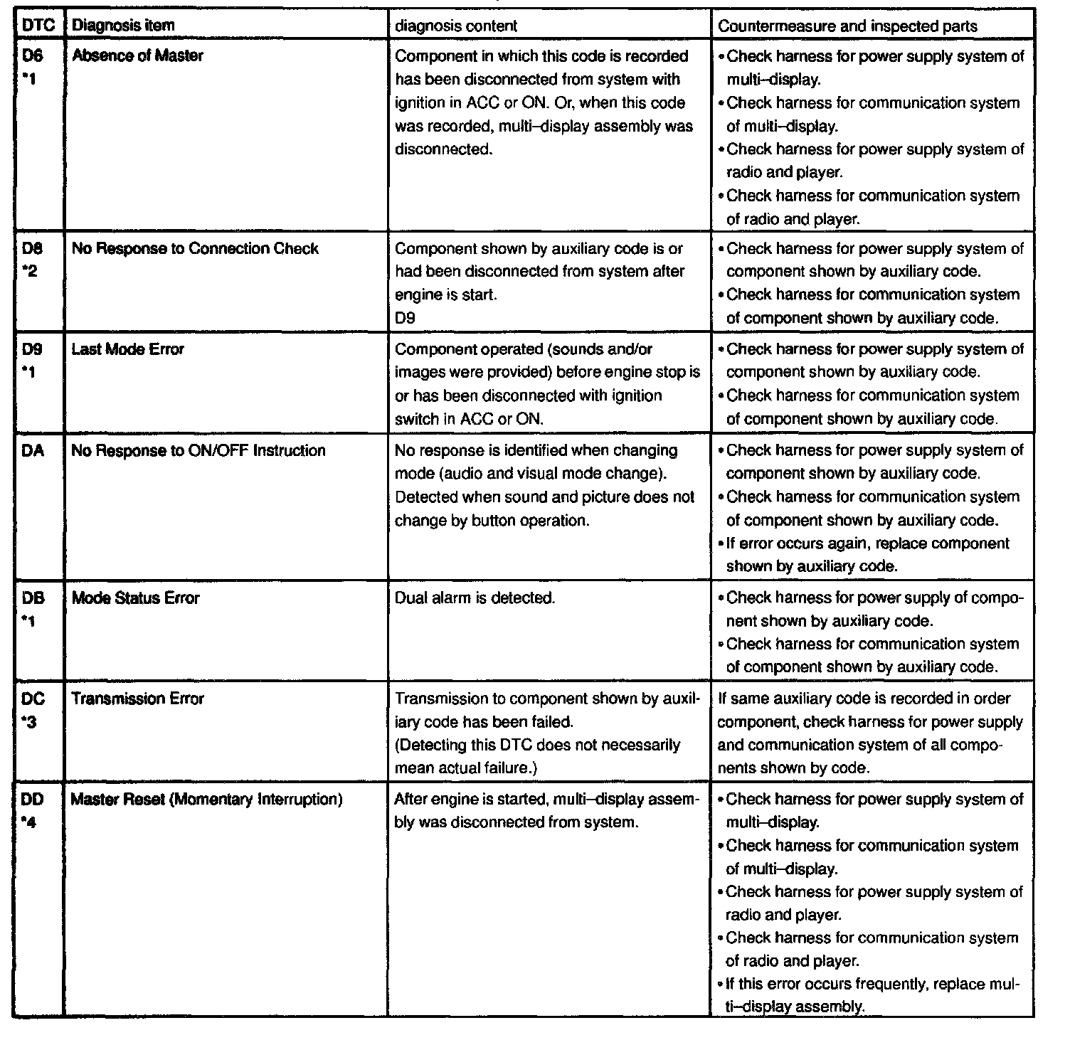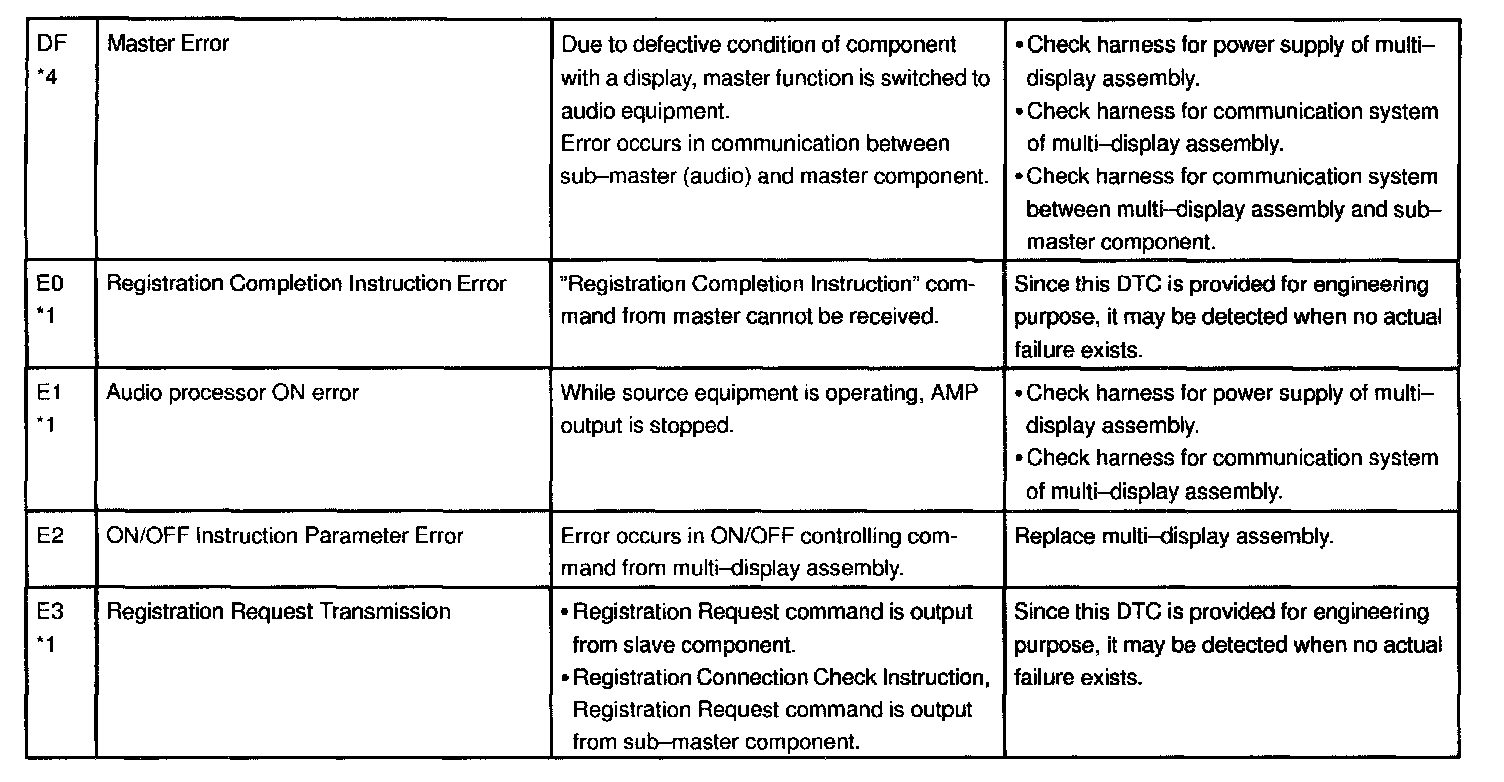 - *4: When 210 sec. has passed after pulling out the power supply connector of the master component with the ignition switch in ACC or ON, this code is stored.