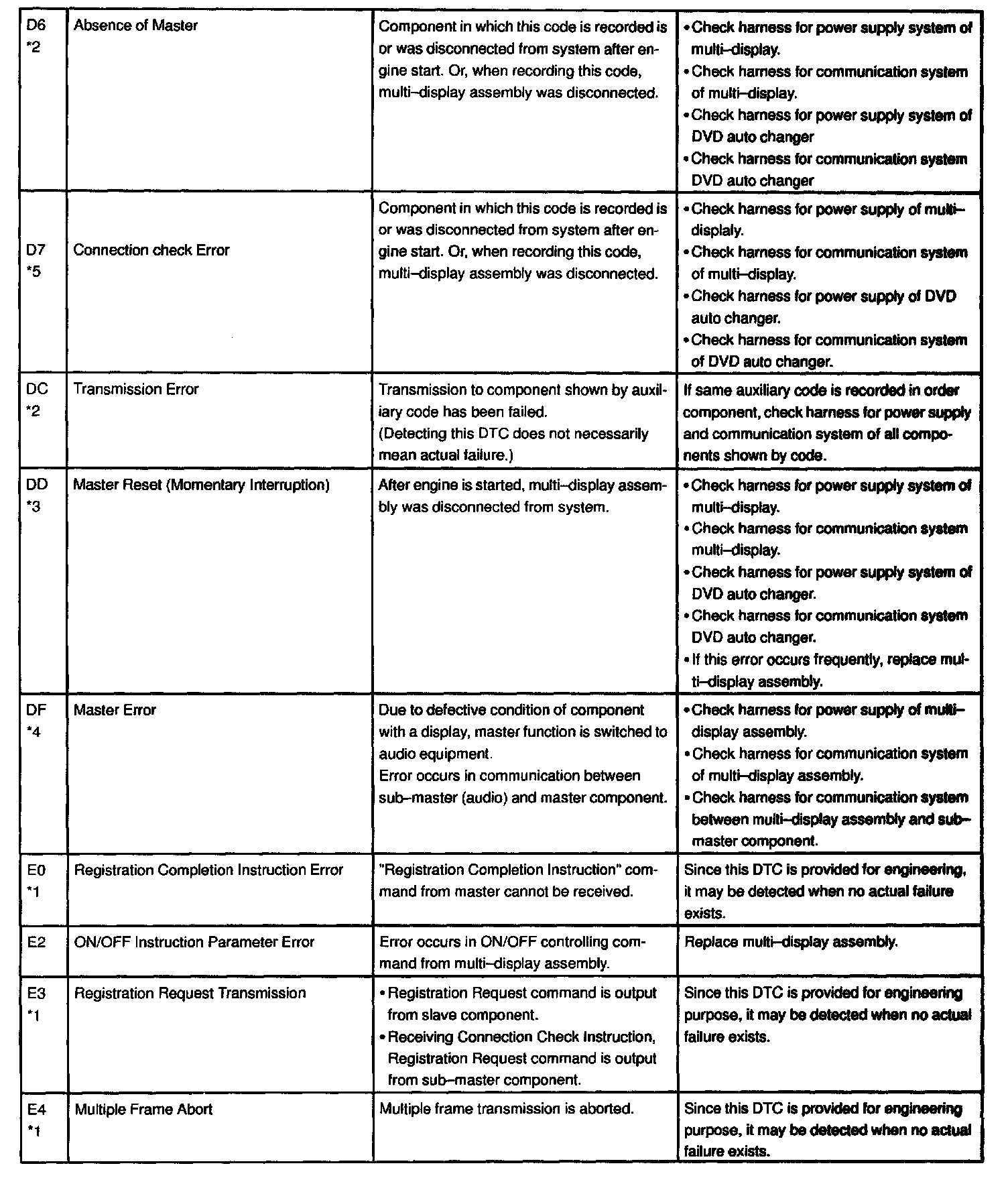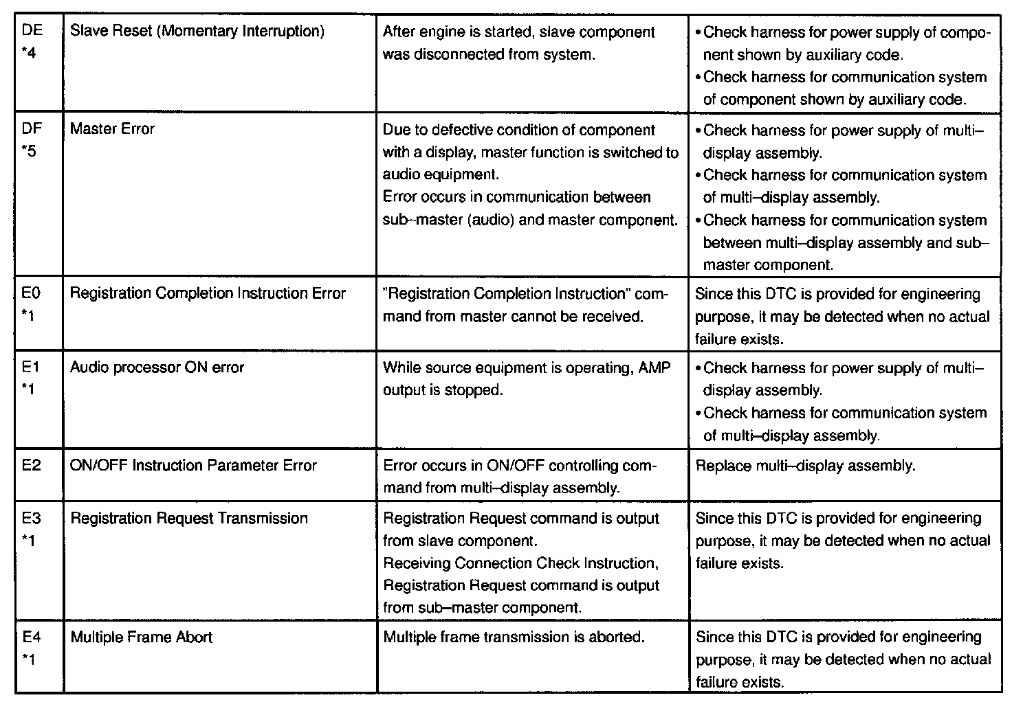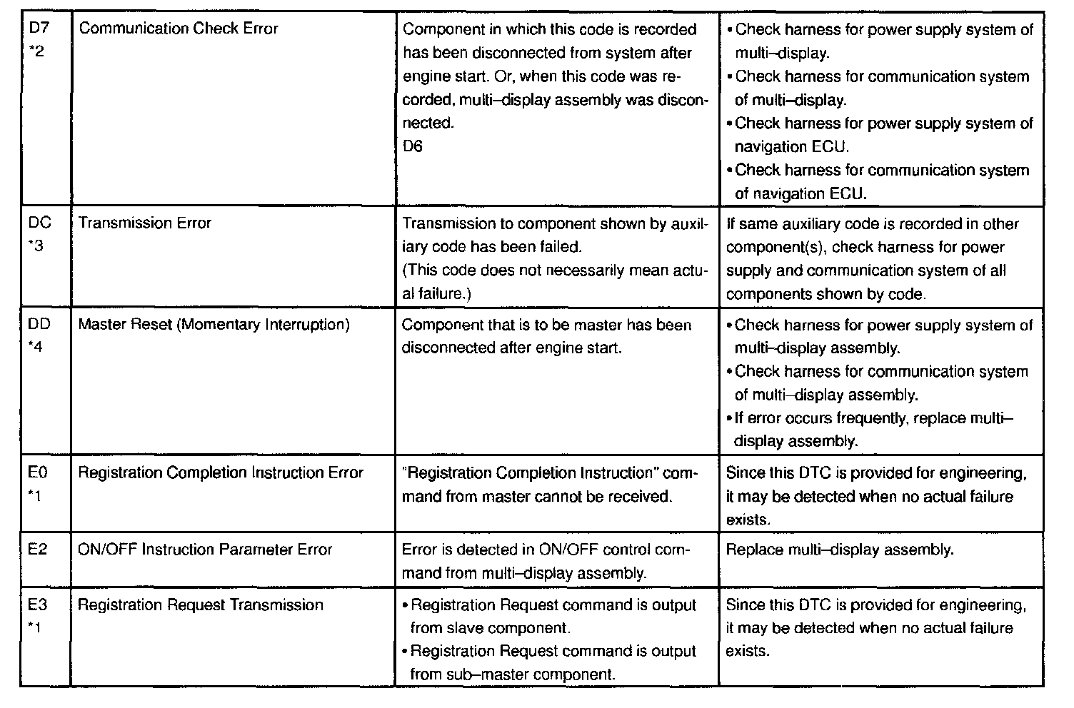 - *4: When 210 sec. has passed after pulling out the power supply connector of the master component with the ignition switch in ACC or ON, this code is stored.