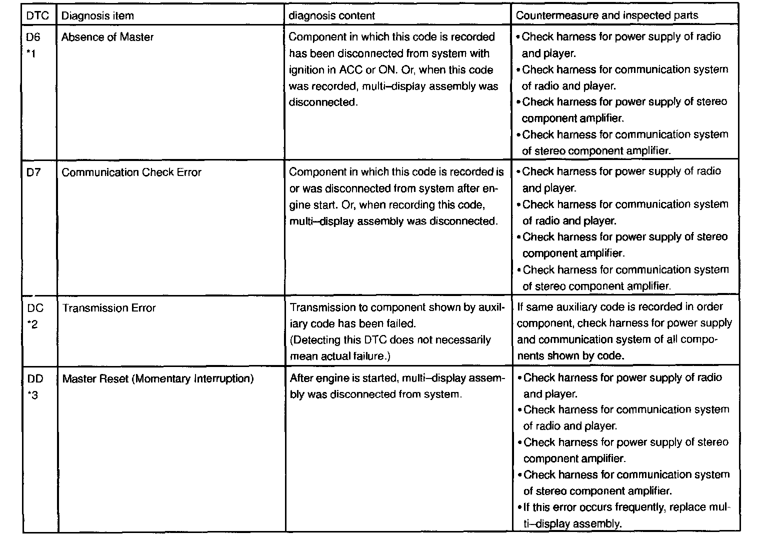 - *2: When 210 sec. has passed after pulling out the power supply connector of the master component with the ignition switch in ACC or ON, this code is stored.
